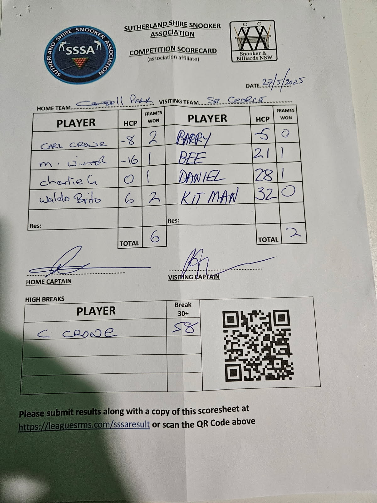| POS | Condell Park #1 | Frame Won | Break | St George #1 | Frame Won | Break | Result Note | Updated on | Update by |