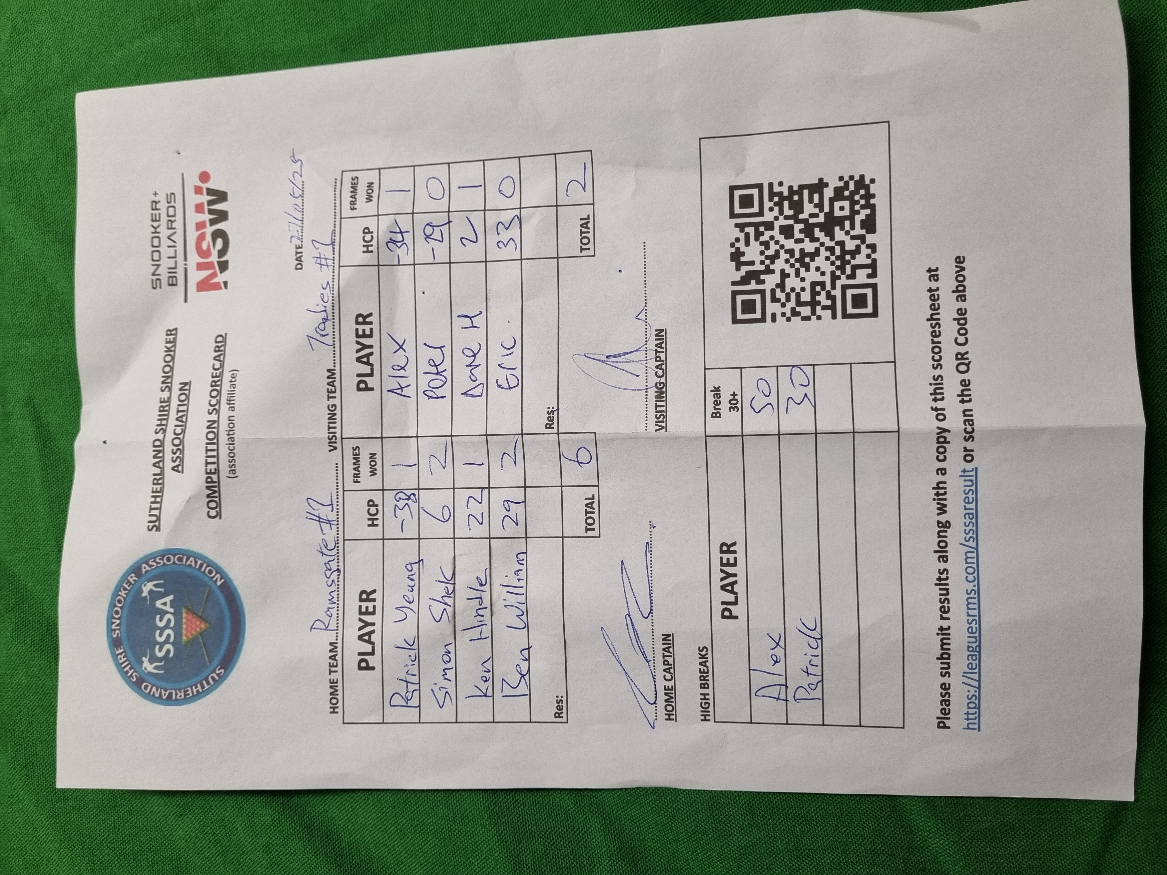 | POS | Ramsgate RSL #1 | Frame Won | Break | Tradies #1 | Frame Won | Break | Result Note | Updated on | Update by |