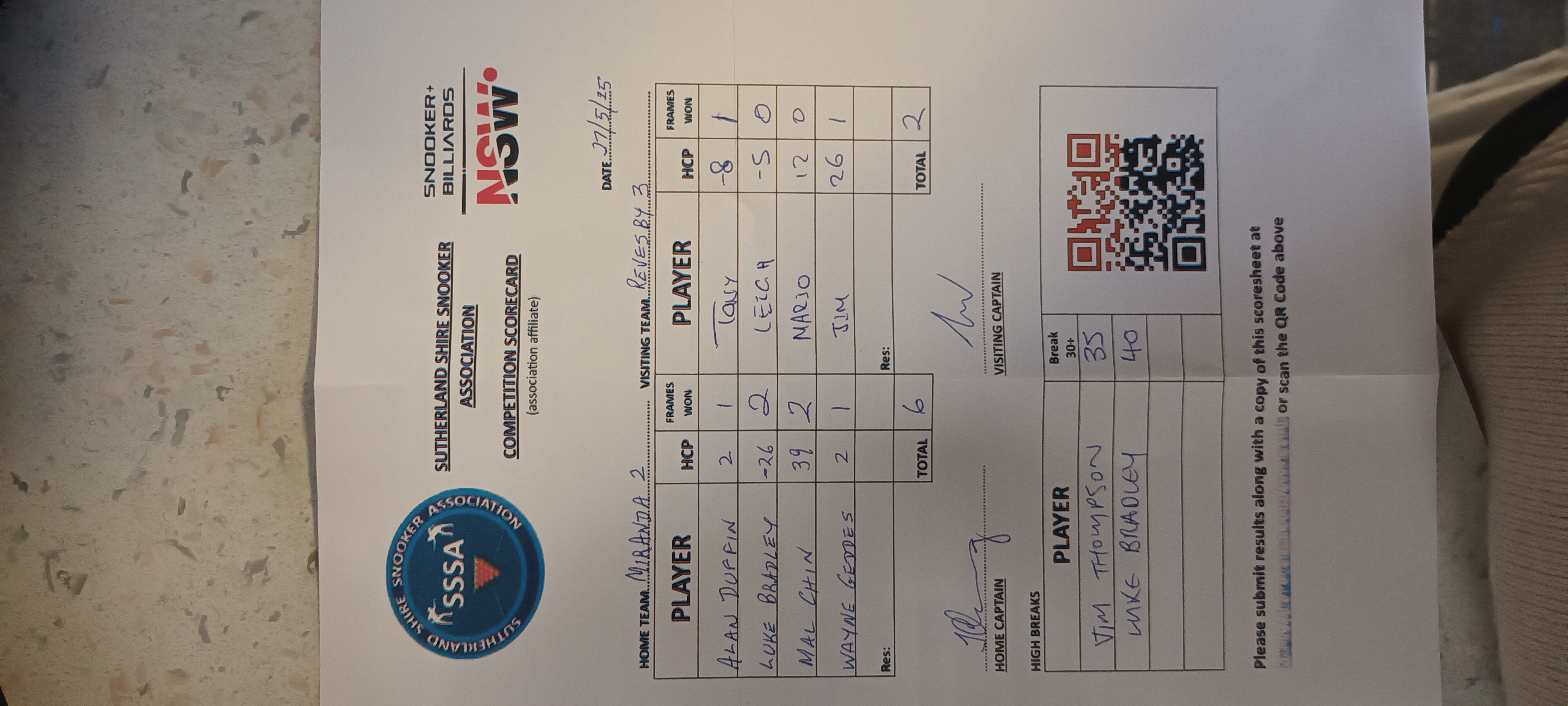 | Luke Bradley (-26) | Leigh Senko (-5) | 2025-05-27 21:22:23 | Miranda RSL #2 | ||||||
