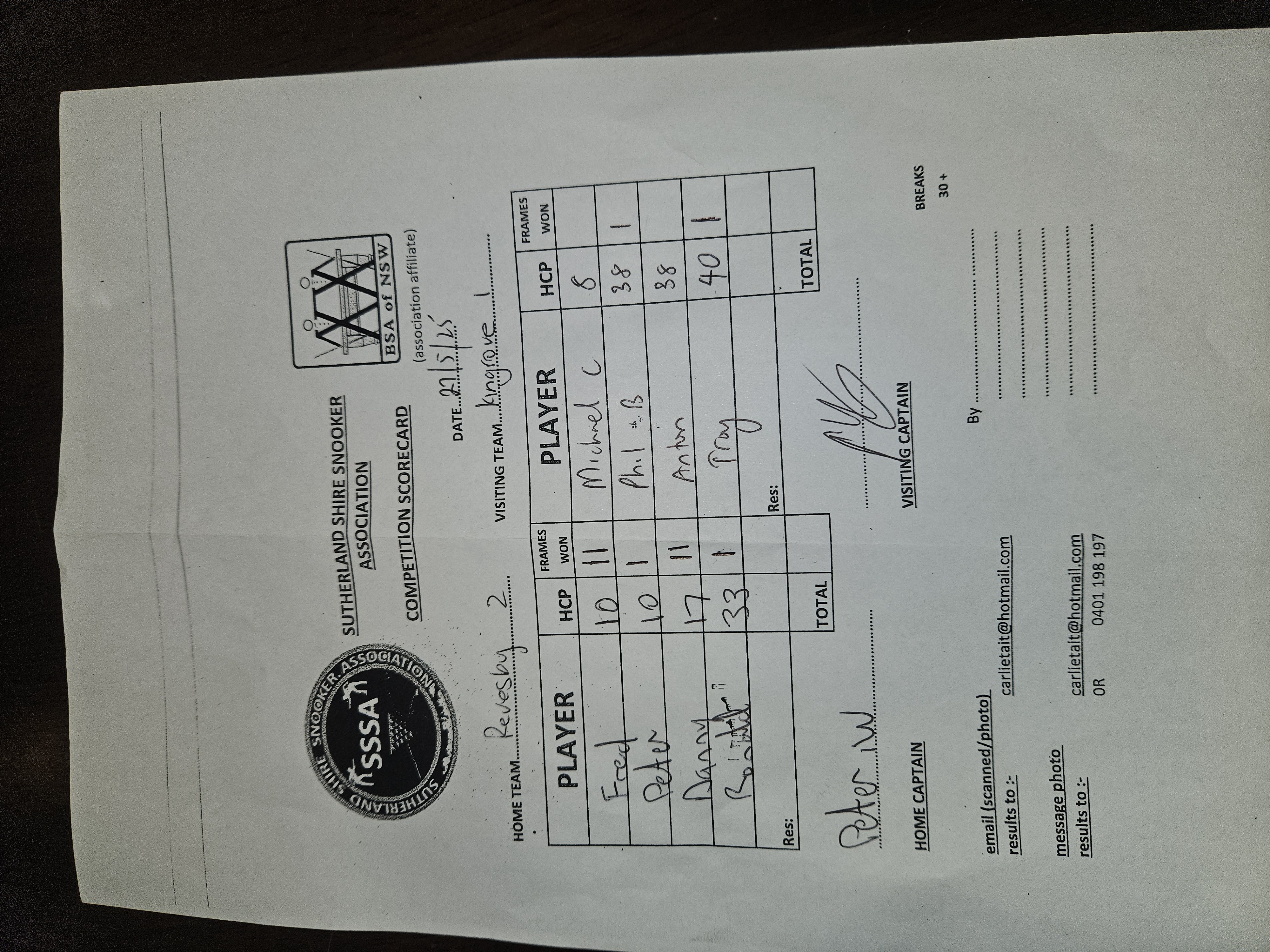 | POS | Revesby Workers #2 | Frame Won | Break | Kingsgrove #1 | Frame Won | Break | Result Note | Updated on | Update by |