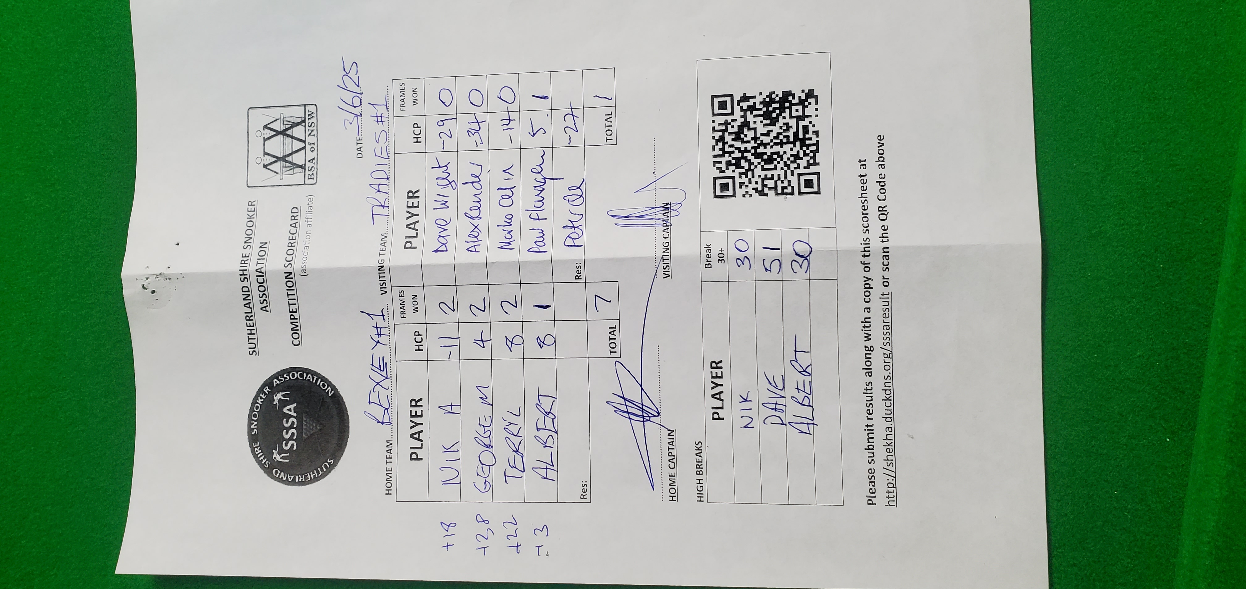 | POS | Bexley RSL #1 | Frame Won | Break | Tradies #1 | Frame Won | Break | Result Note | Updated on | Update by |