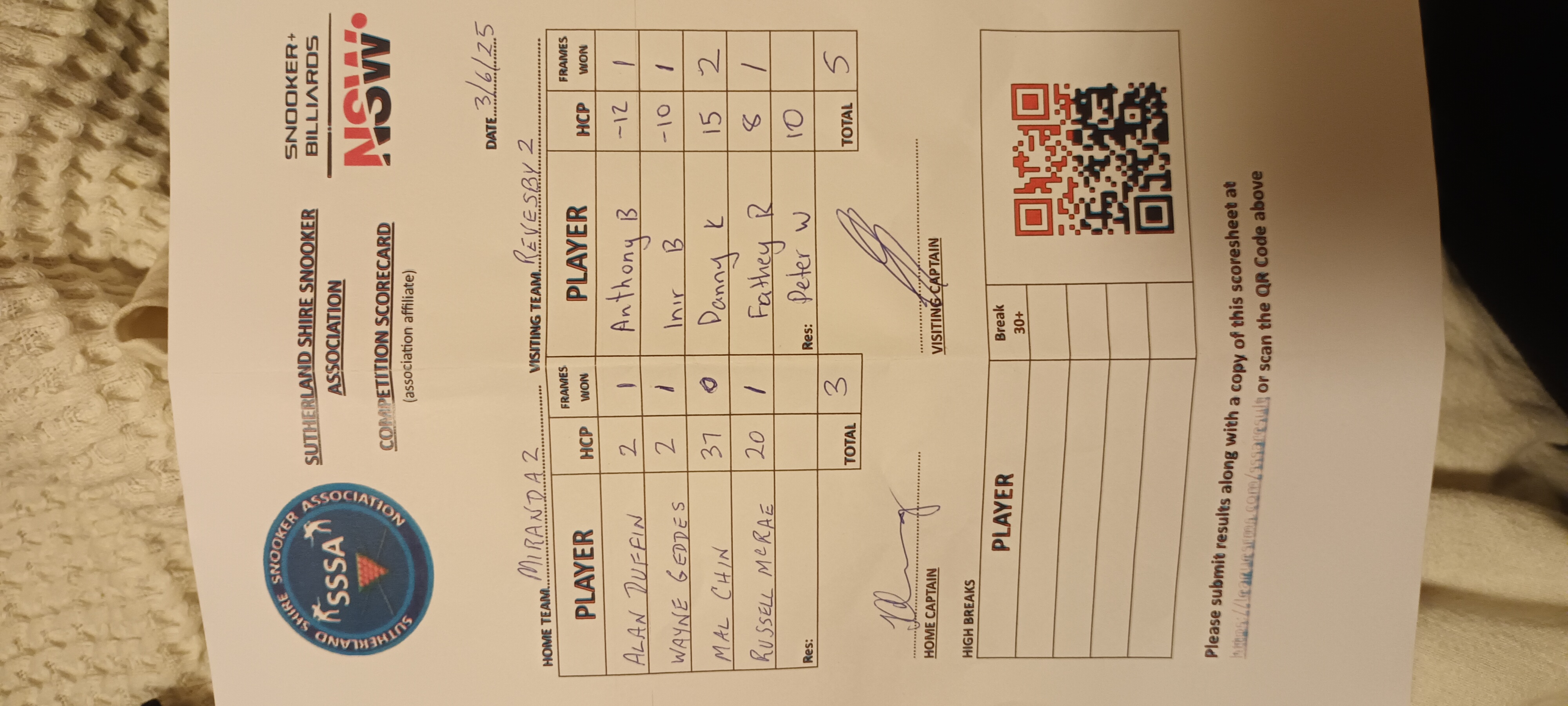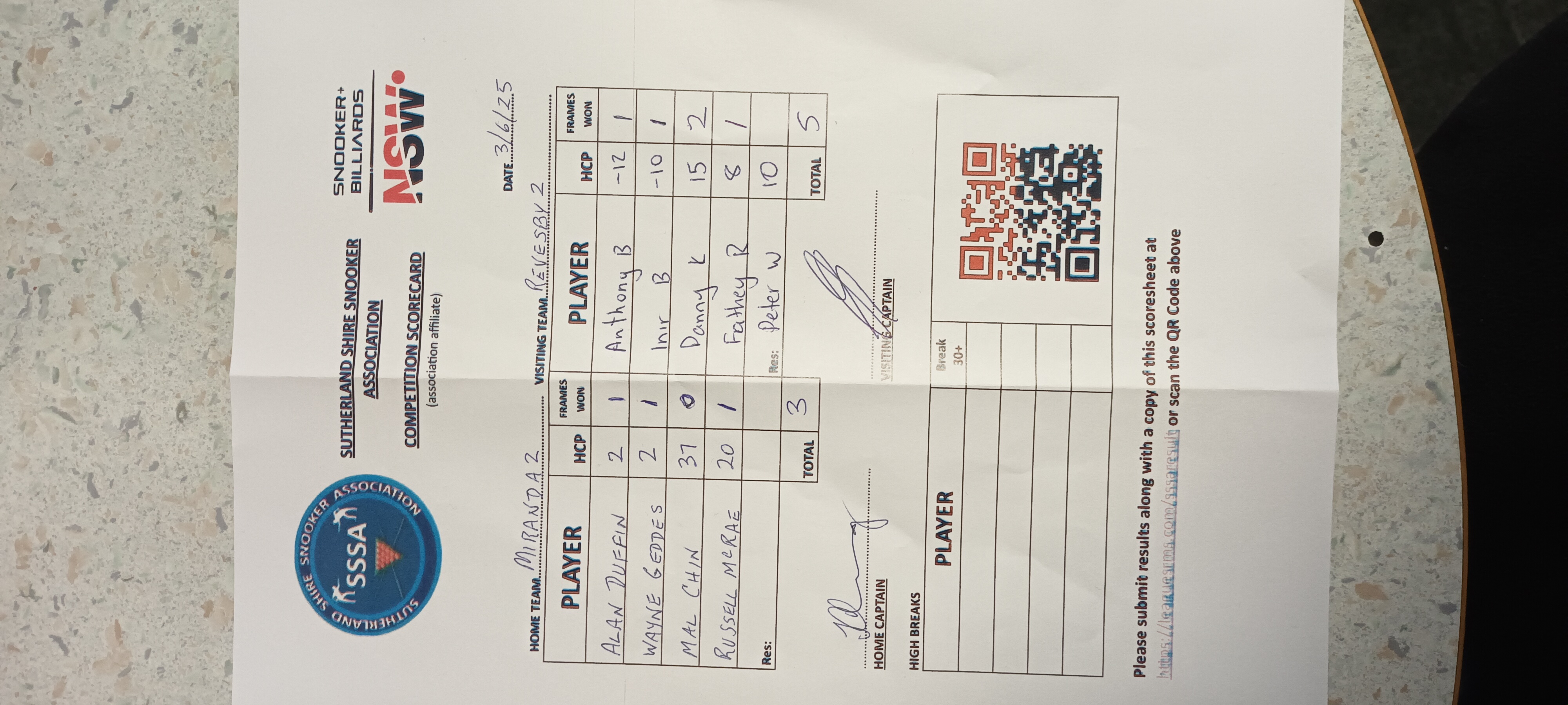 | POS | Miranda RSL #2 | Frame Won | Break | Revesby Workers #2 | Frame Won | Break | Result Note | Updated on | Update by |