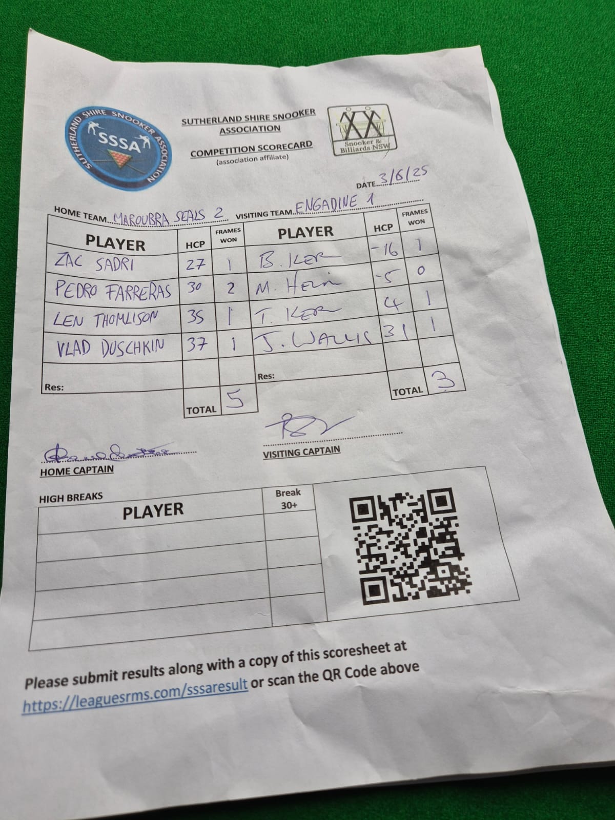 | POS | Maroubra Seals #2 | Frame Won | Break | Engadine #1 | Frame Won | Break | Result Note | Updated on | Update by |