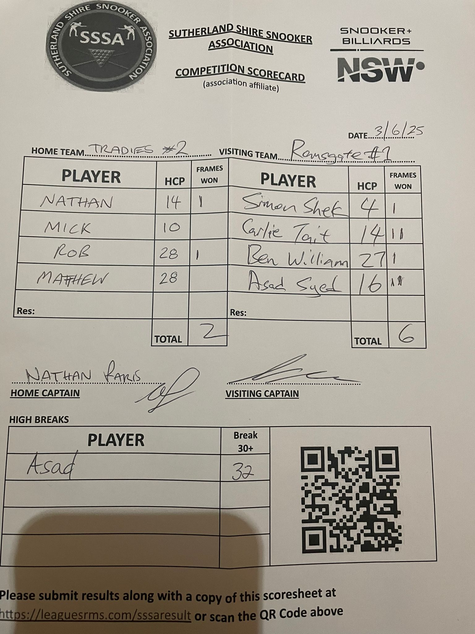 | Matthew Jones (28) | Asadullah Hussaini Syed (16) | 2025-06-03 22:23:44 | Tradies #2 |