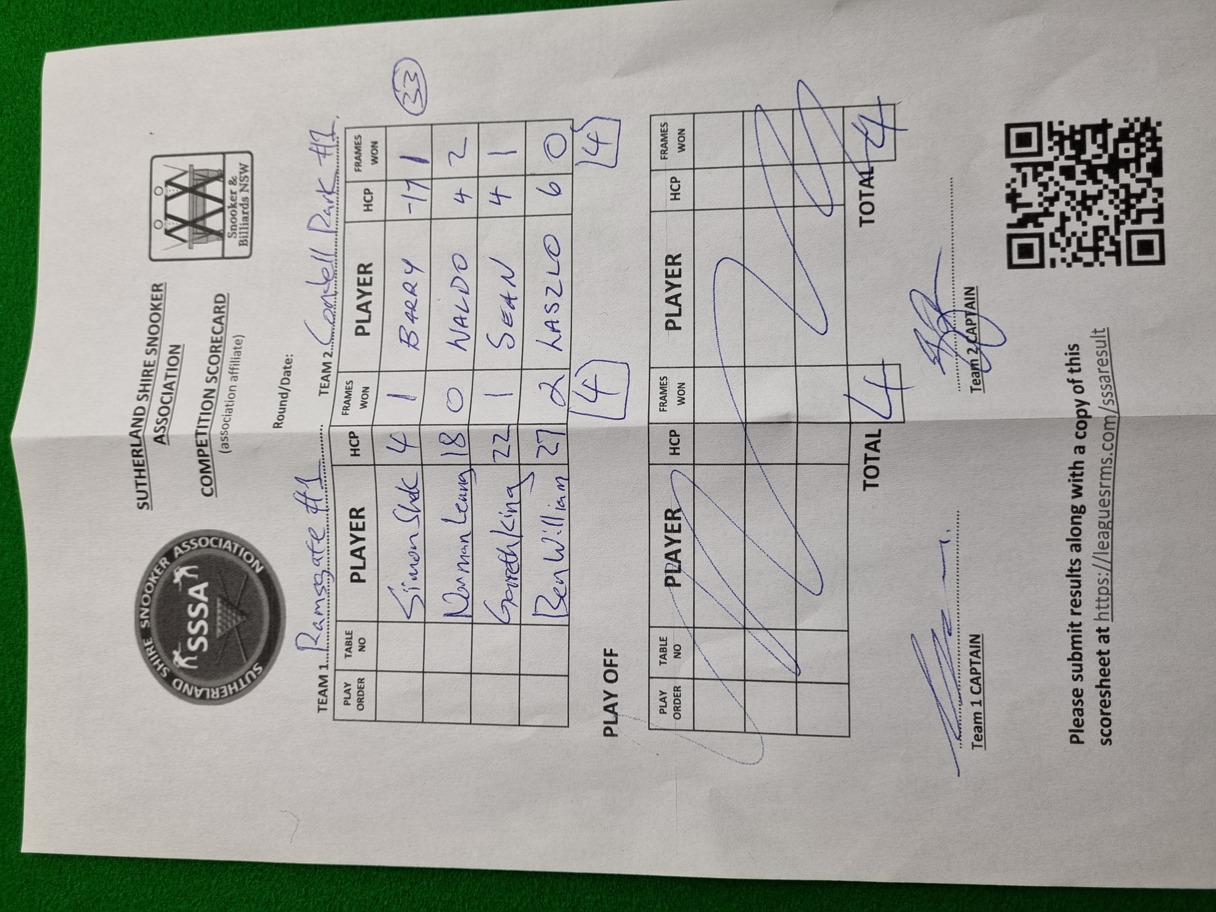 | POS | Ramsgate RSL #1 | Frame Won | Break | Condell Park #1 | Frame Won | Break | Result Note | Updated on | Update by |