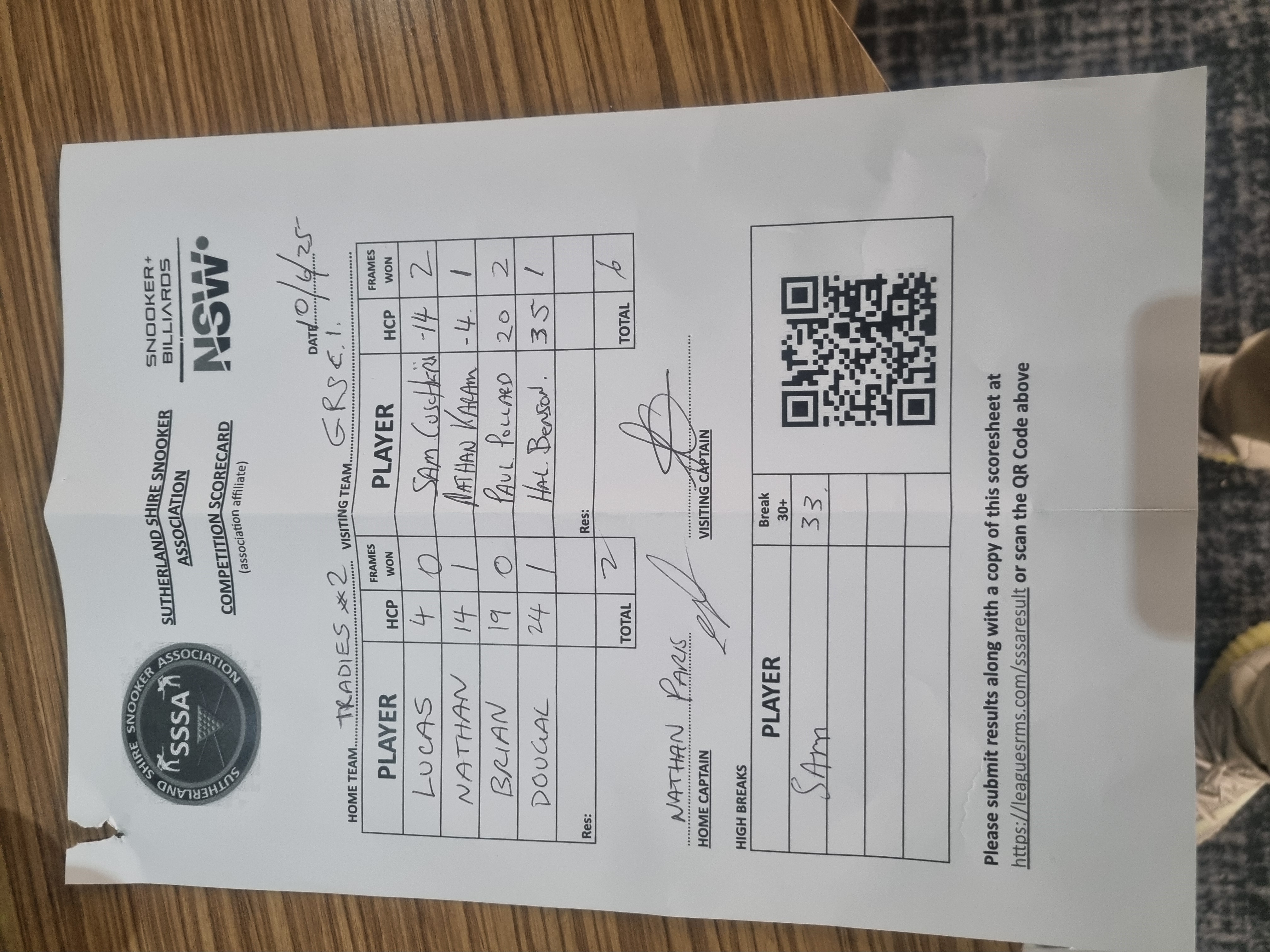 | POS | Tradies #2 | Frame Won | Break | Georges River #1 | Frame Won | Break | Result Note | Updated on | Update by |