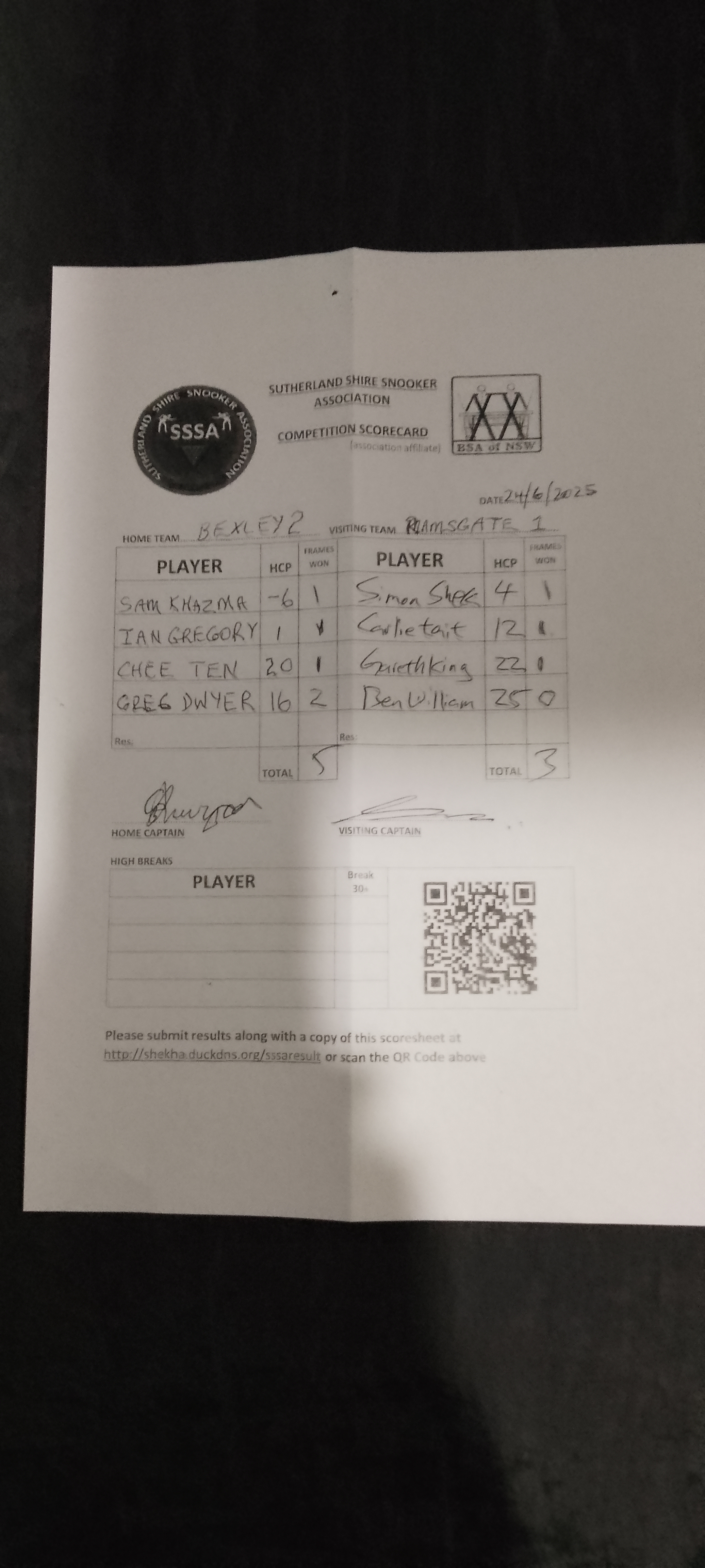 | POS | Bexley RSL #2 | Frame Won | Break | Ramsgate RSL #1 | Frame Won | Break | Result Note | Updated on | Update by |