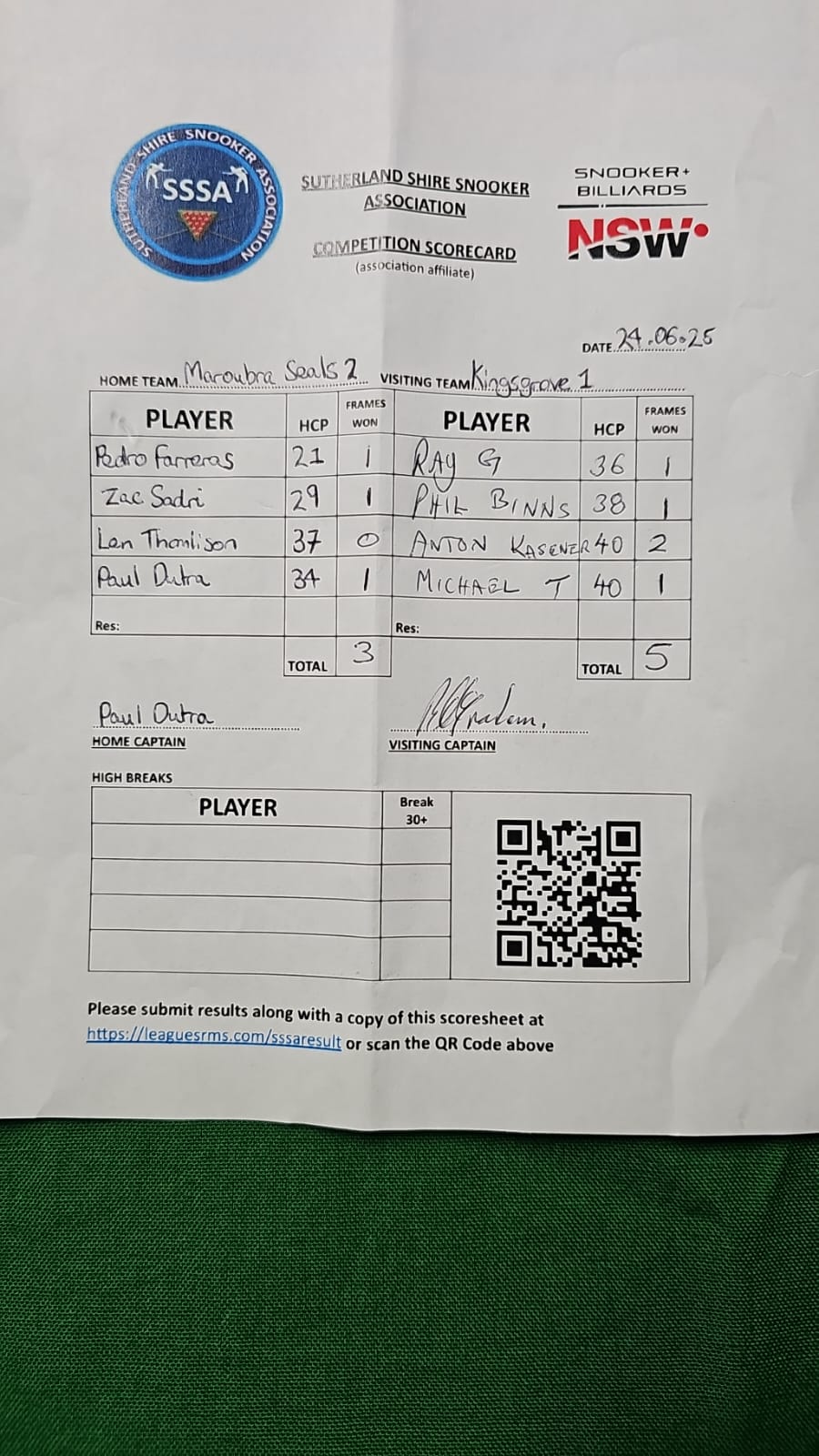 | POS | Maroubra Seals #2 | Frame Won | Break | Kingsgrove #1 | Frame Won | Break | Result Note | Updated on | Update by |