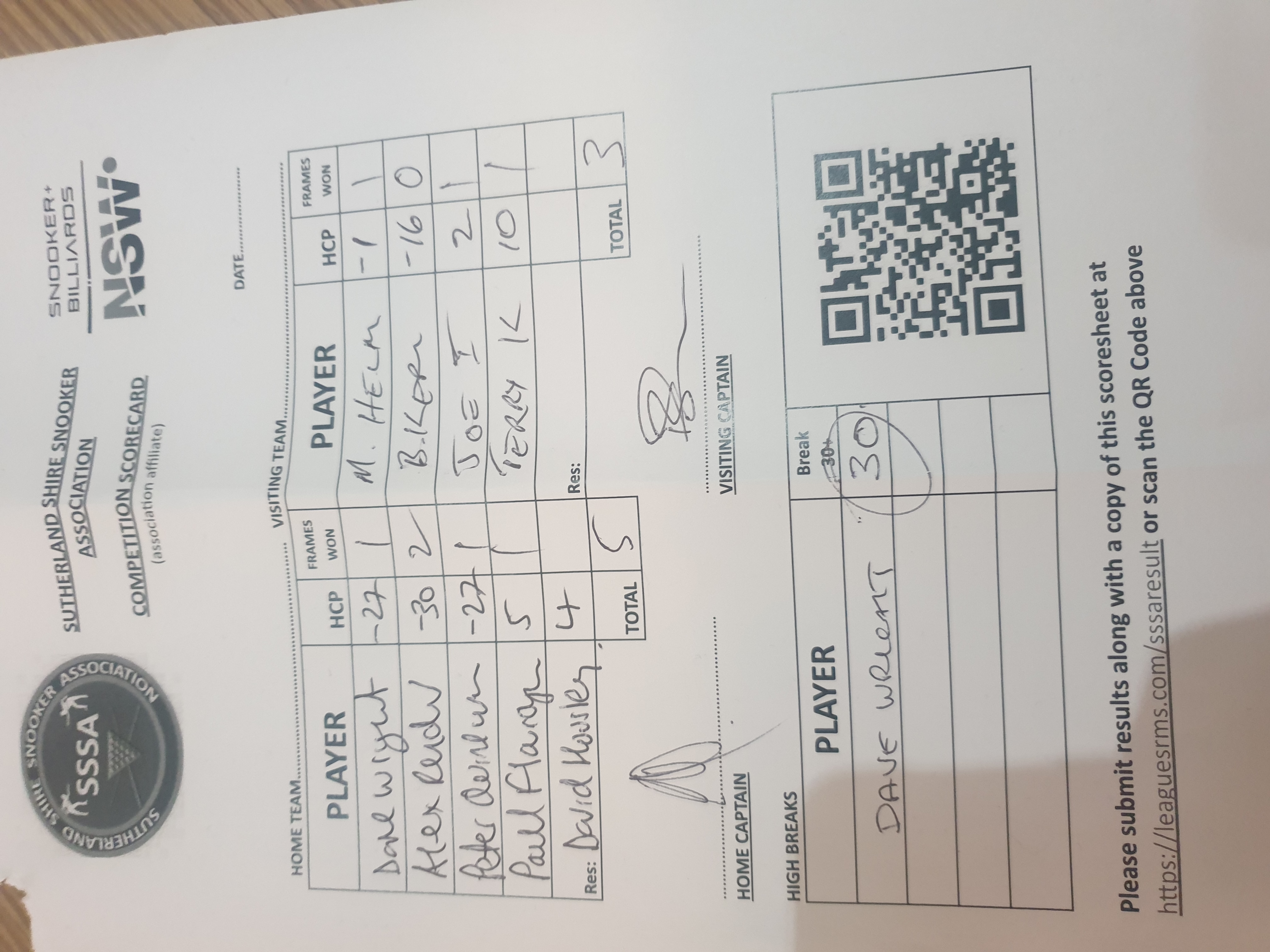 | POS | Tradies #1 | Frame Won | Break | Engadine #1 | Frame Won | Break | Result Note | Updated on | Update by |