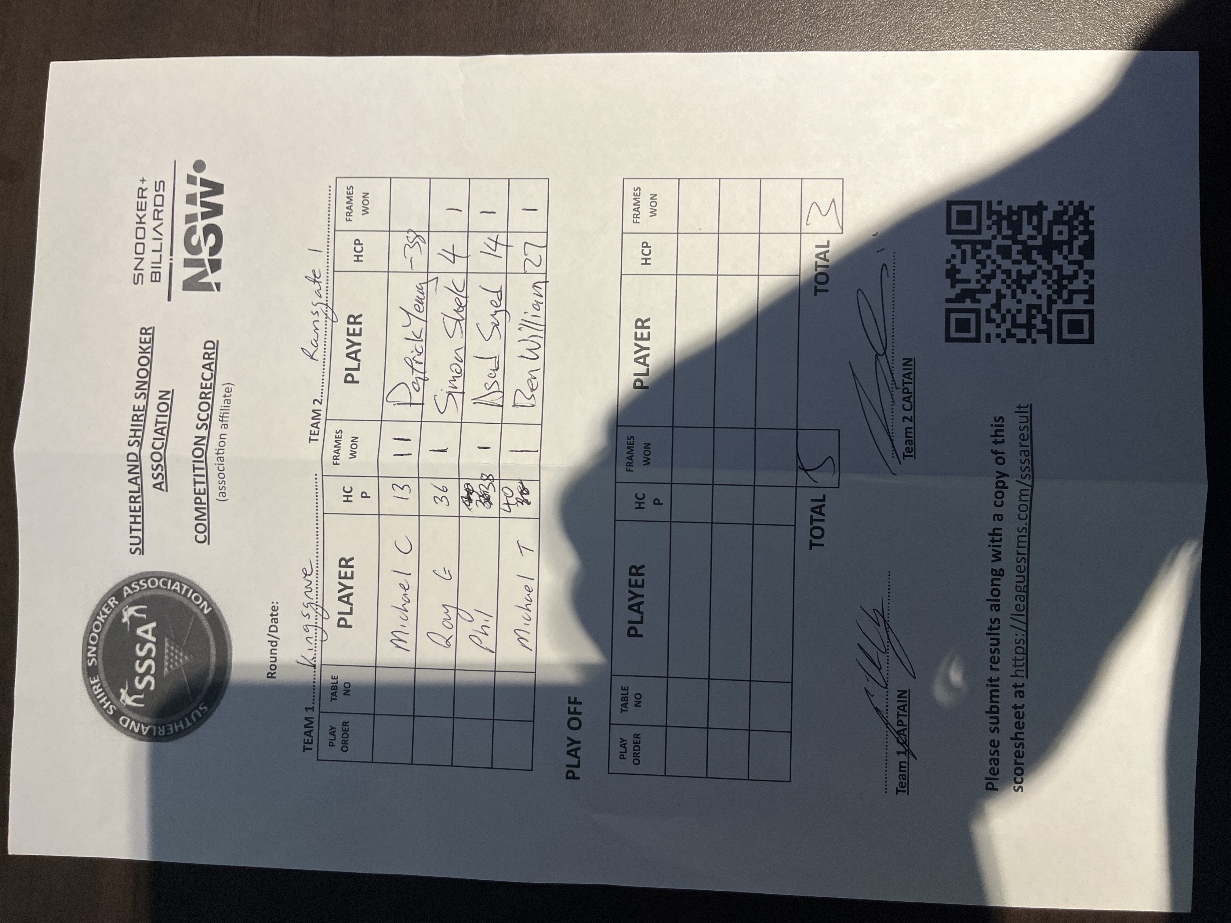 | POS | Kingsgrove #1 | Frame Won | Break | Ramsgate RSL #1 | Frame Won | Break | Result Note | Updated on | Update by |