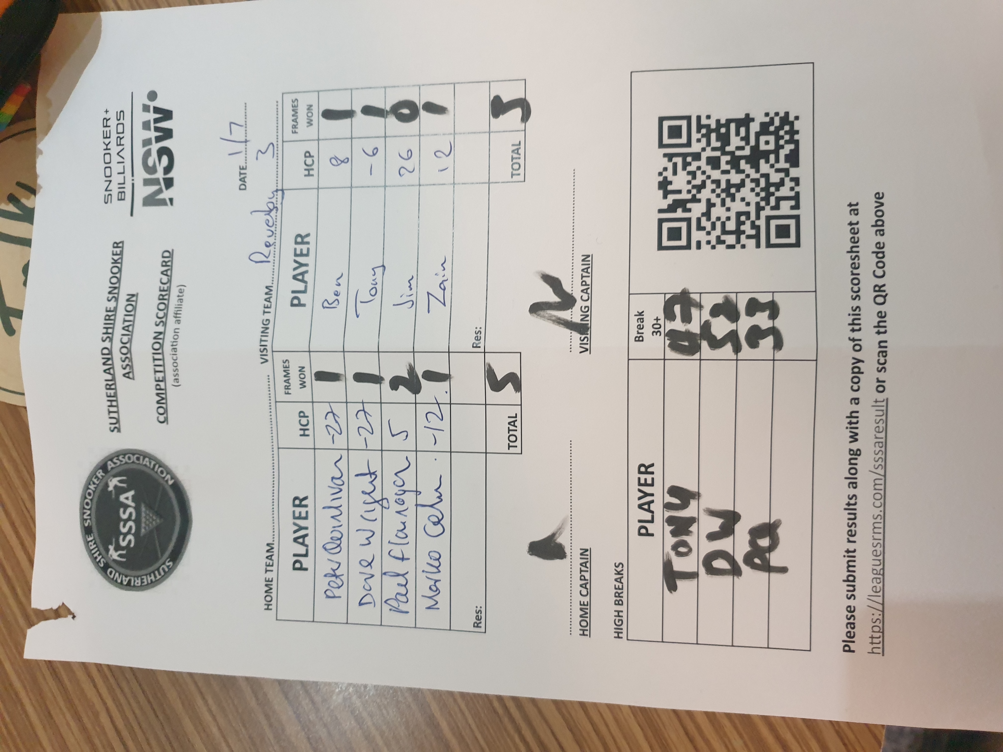 | POS | Tradies #1 | Frame Won | Break | Revesby Workers #3 | Frame Won | Break | Result Note | Updated on | Update by |