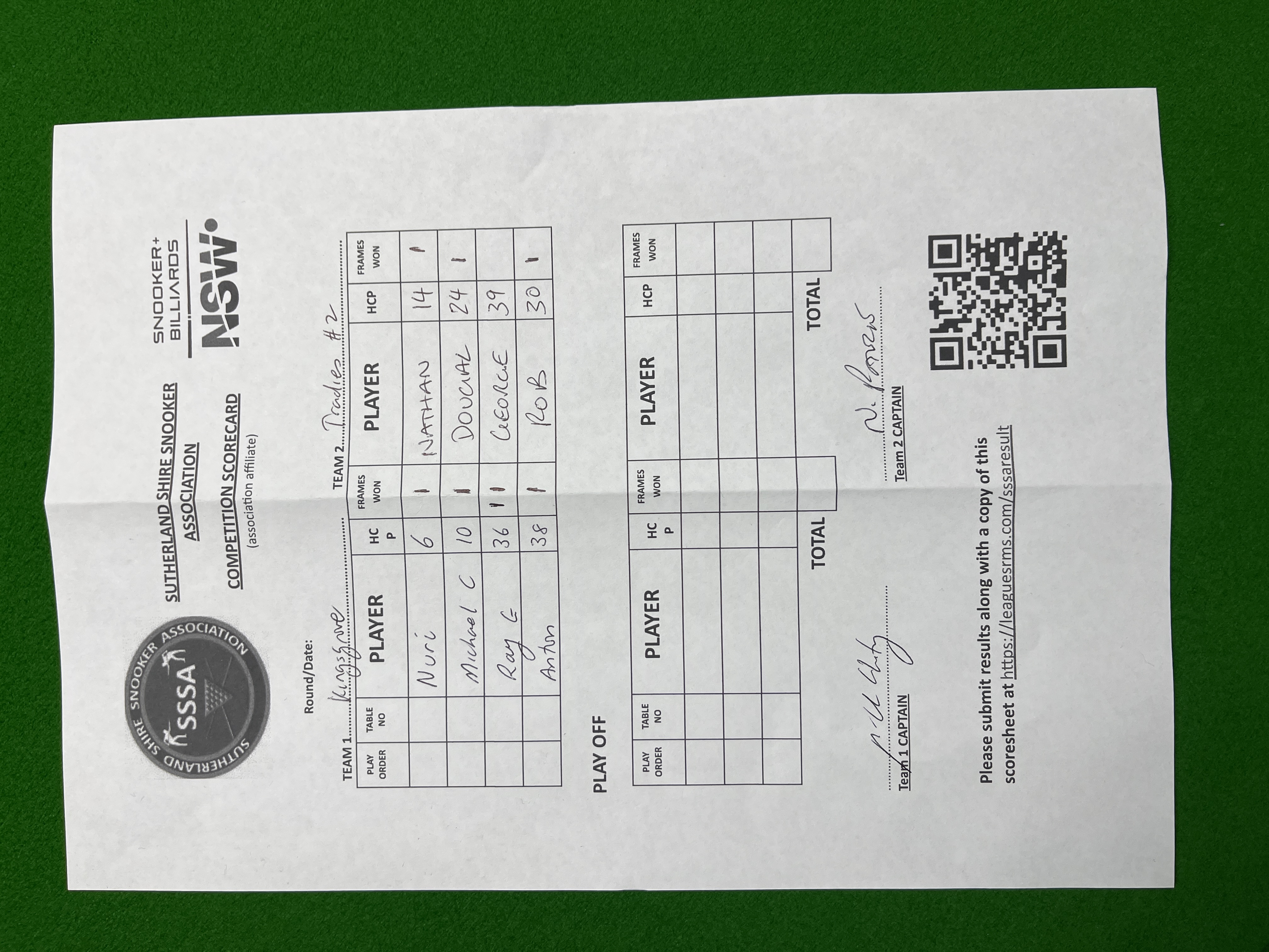 | POS | Kingsgrove #1 | Frame Won | Break | Tradies #2 | Frame Won | Break | Result Note | Updated on | Update by |