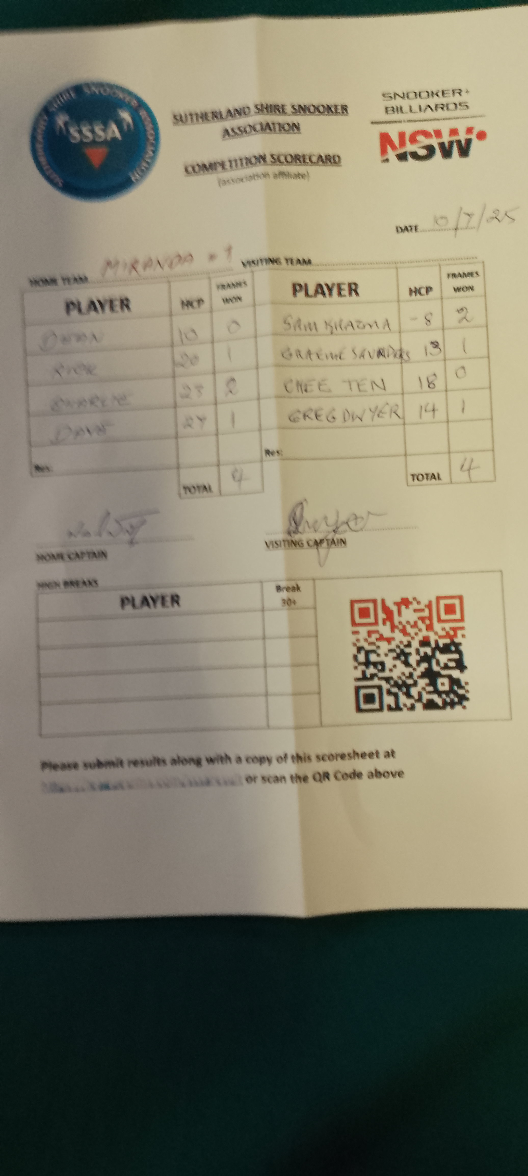| POS | Miranda RSL #1 | Frame Won | Break | Bexley RSL #2 | Frame Won | Break | Result Note | Updated on | Update by |