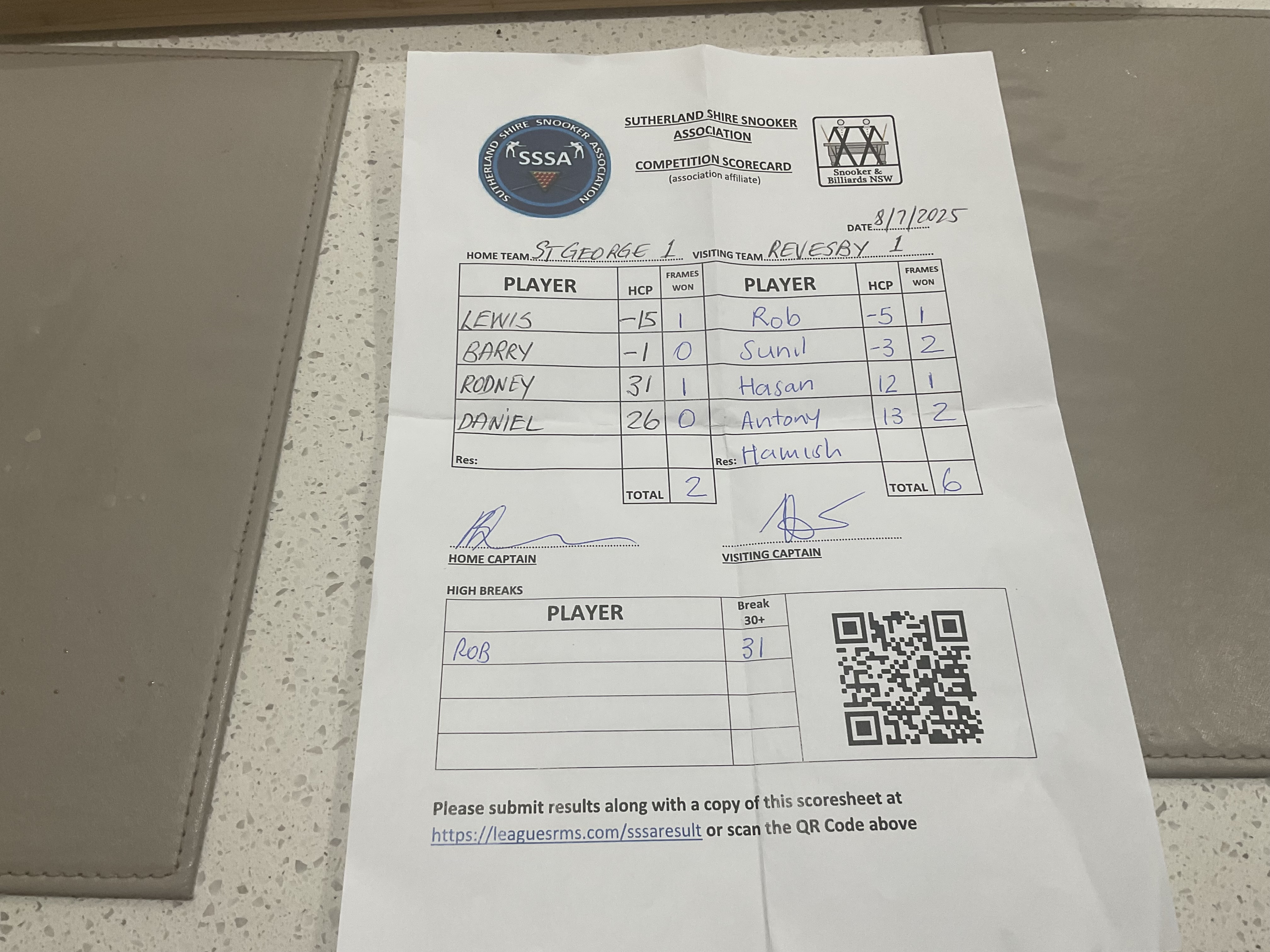 | POS | St George #1 | Frame Won | Break | Revesby Workers #1 | Frame Won | Break | Result Note | Updated on | Update by |