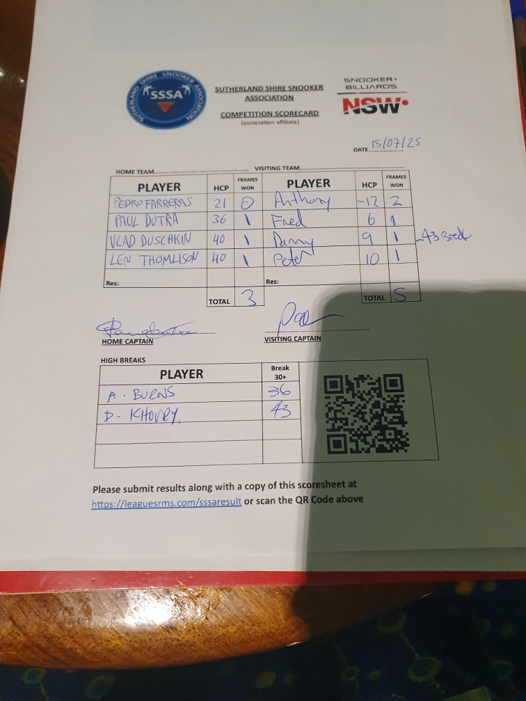 | POS | Maroubra Seals #2 | Frame Won | Break | Revesby Workers #2 | Frame Won | Break | Result Note | Updated on | Update by |