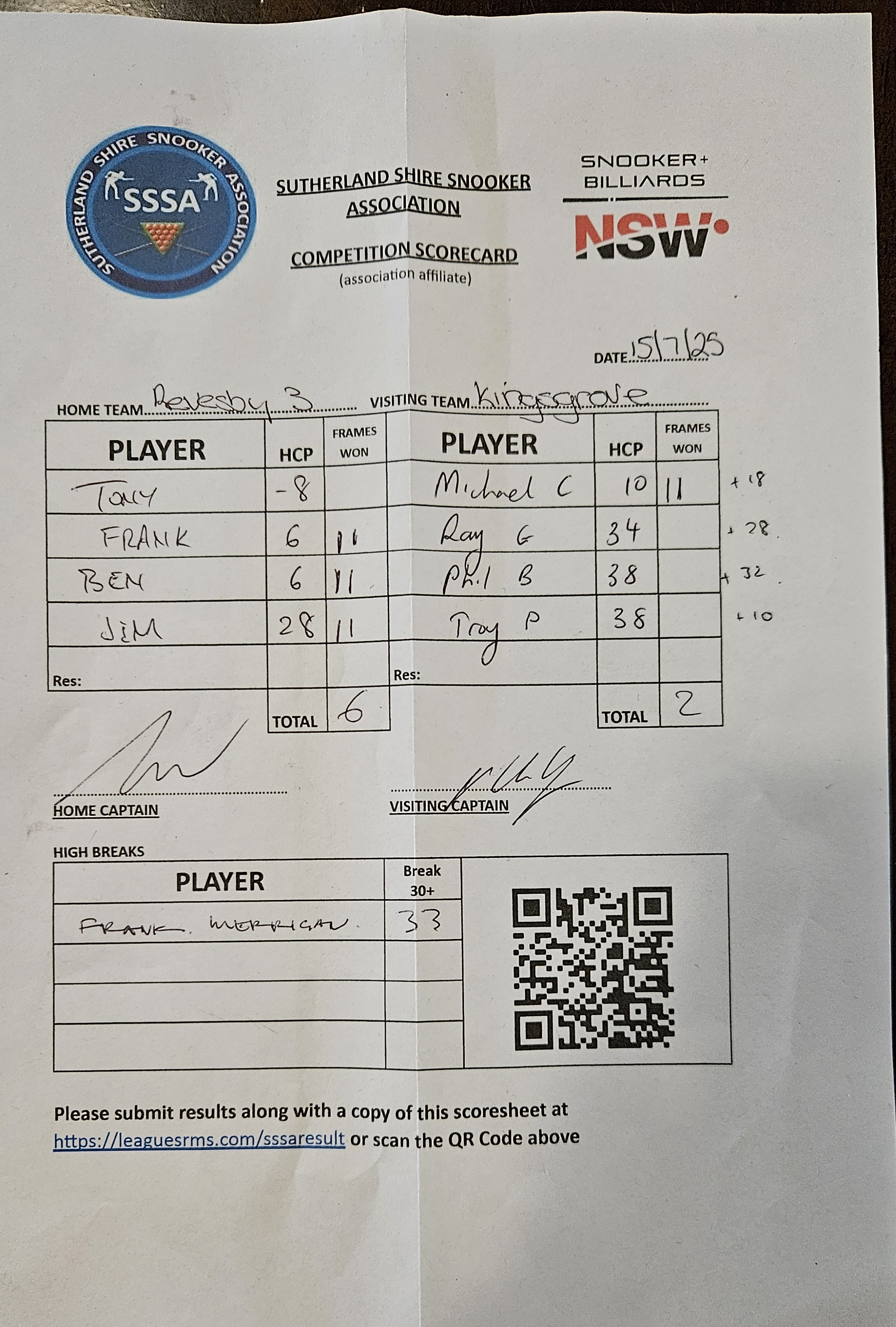 | POS | Revesby Workers #3 | Frame Won | Break | Kingsgrove #1 | Frame Won | Break | Result Note | Updated on | Update by |
