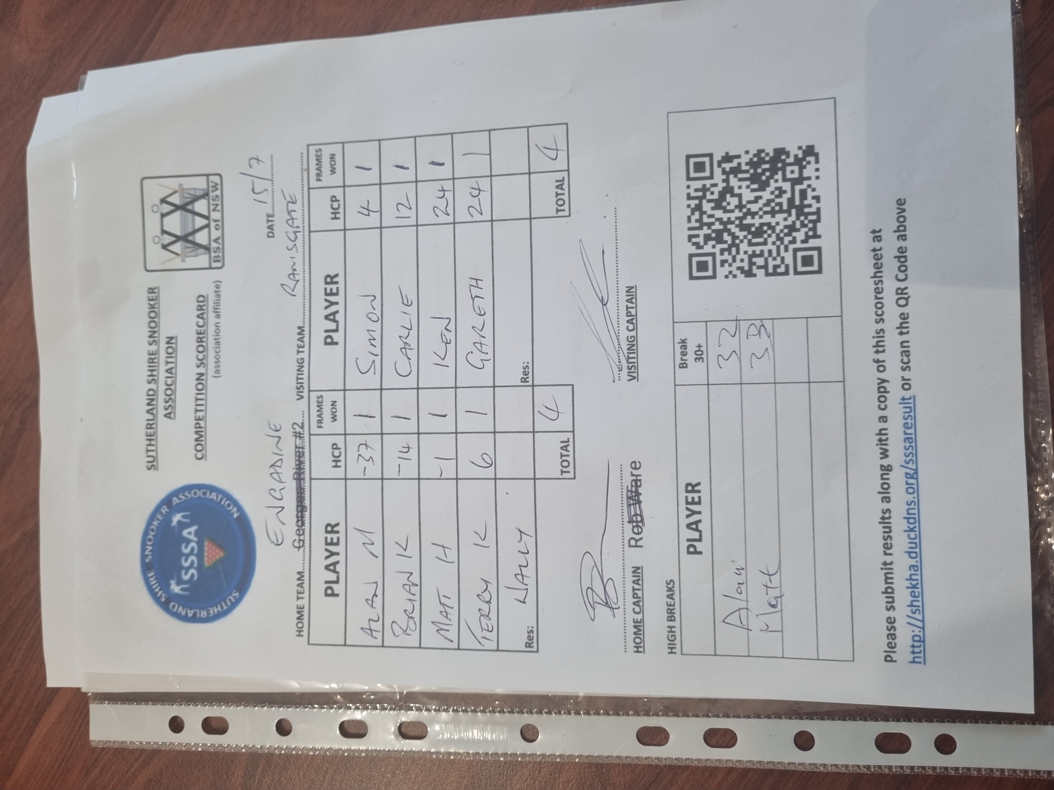 | POS | Engadine #1 | Frame Won | Break | Ramsgate RSL #1 | Frame Won | Break | Result Note | Updated on | Update by |