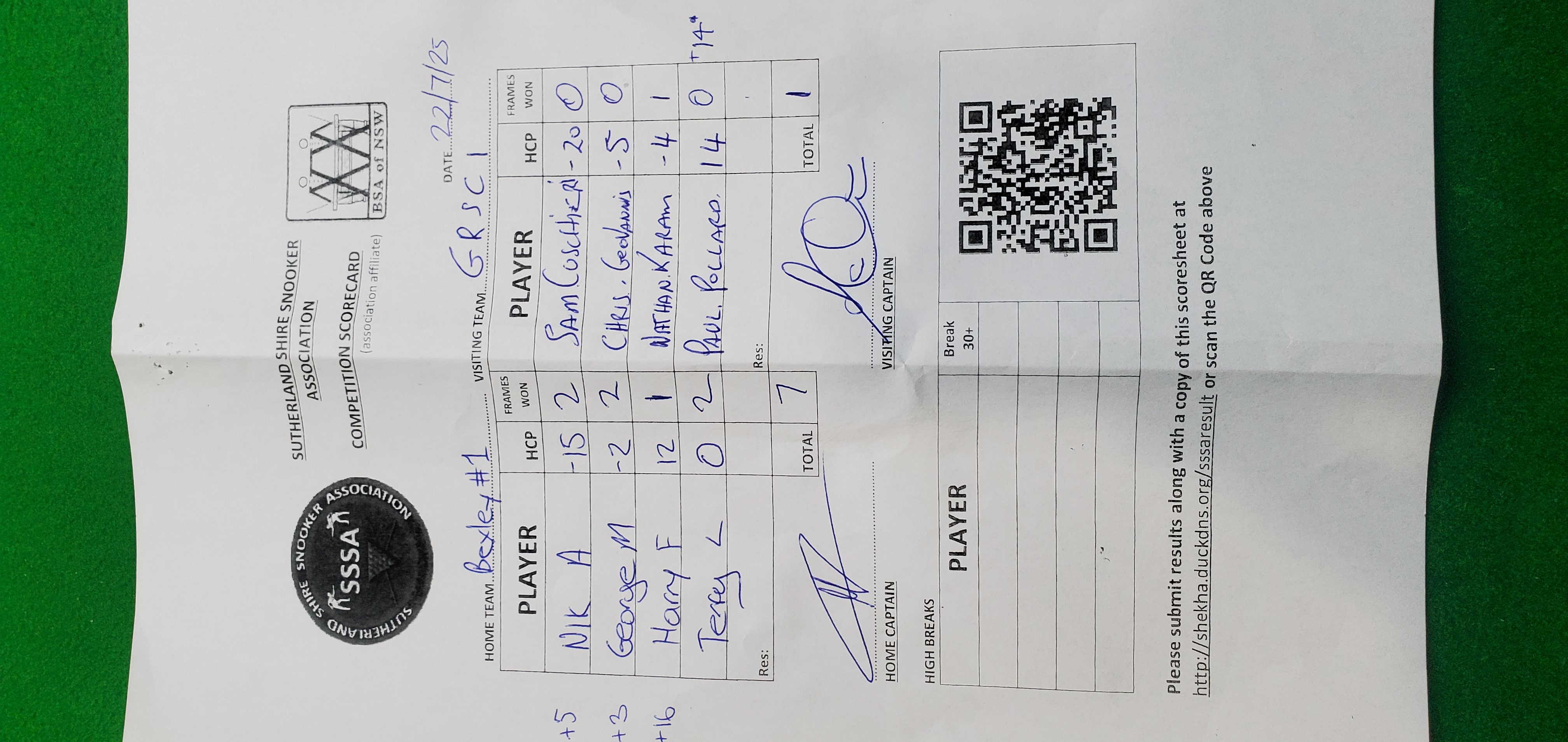 | POS | Bexley RSL #1 | Frame Won | Break | Georges River #1 | Frame Won | Break | Result Note | Updated on | Update by |