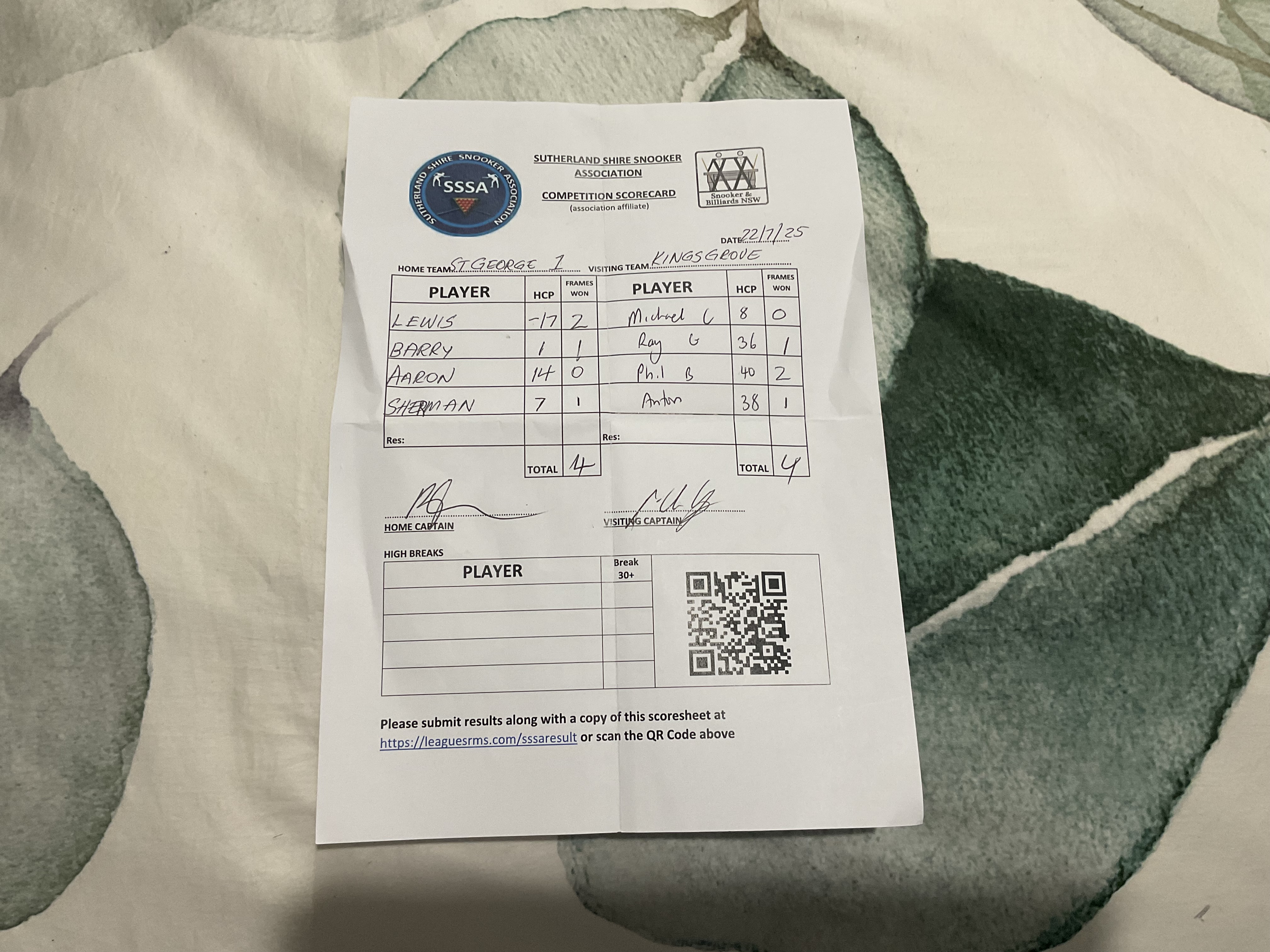 | POS | St George #1 | Frame Won | Break | Kingsgrove #1 | Frame Won | Break | Result Note | Updated on | Update by |