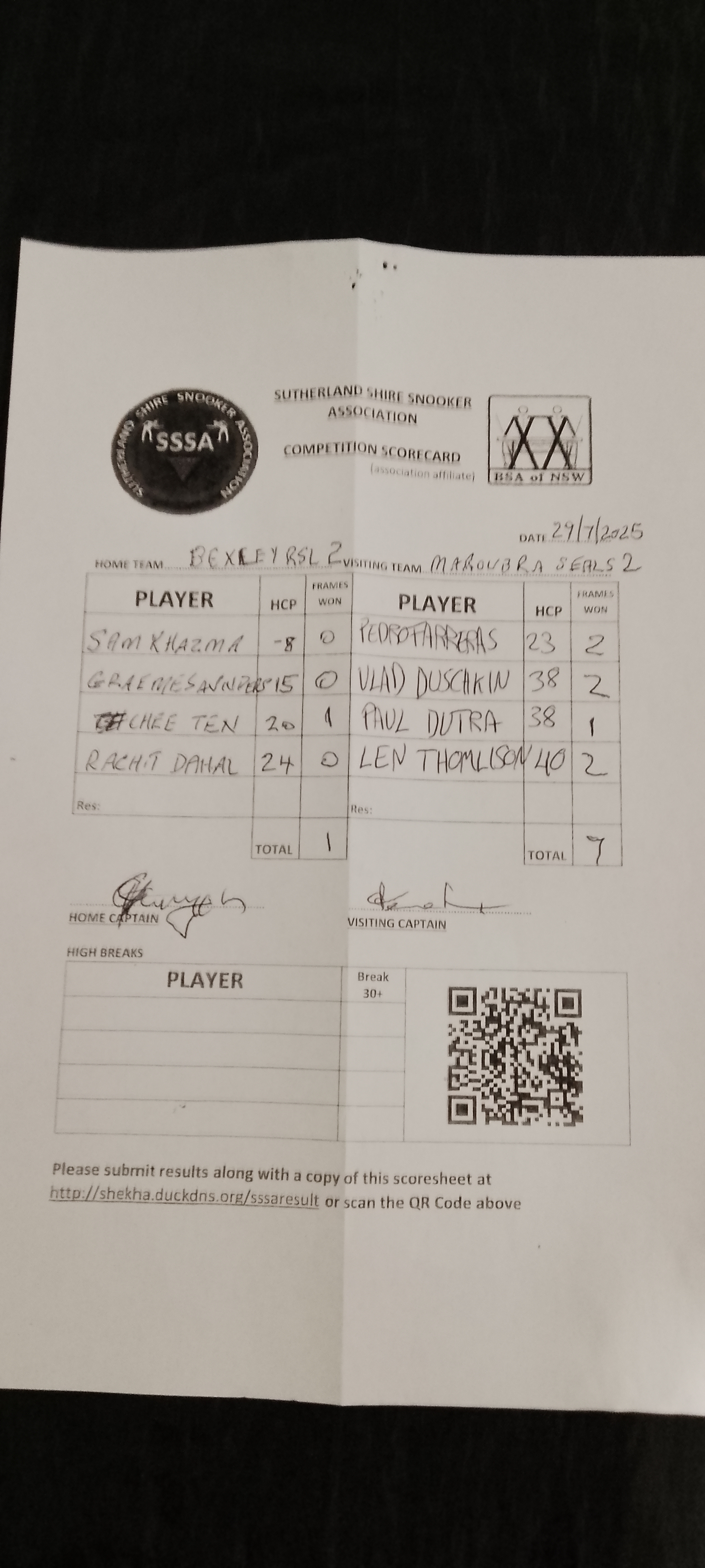 | Chee Ten (20) | Paul Dutra (38) | 2025-07-29 22:05:58 | Bexley RSL #2 | ||||||
