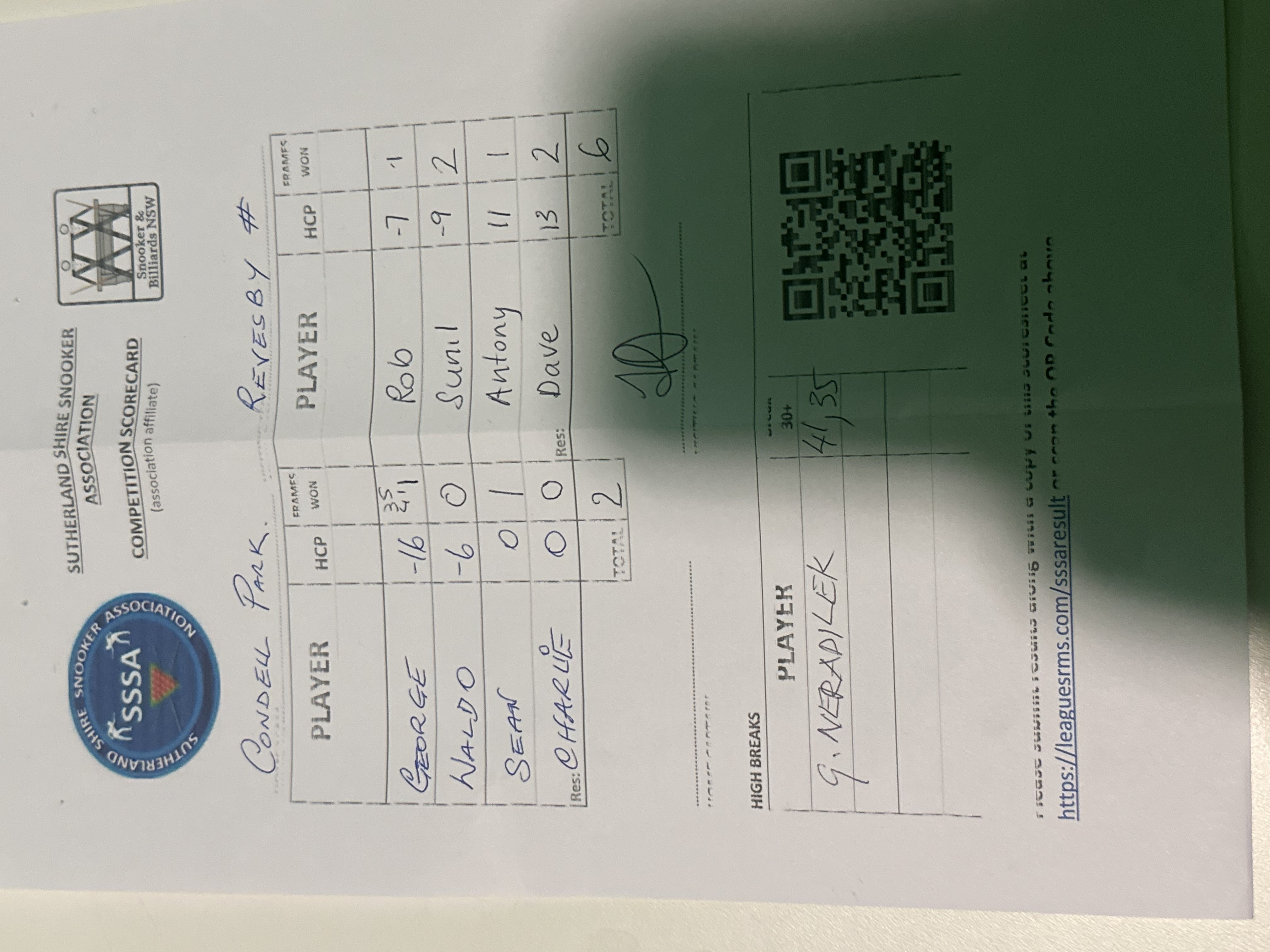 | POS | Condell Park #1 | Frame Won | Break | Revesby Workers #1 | Frame Won | Break | Result Note | Updated on | Update by |