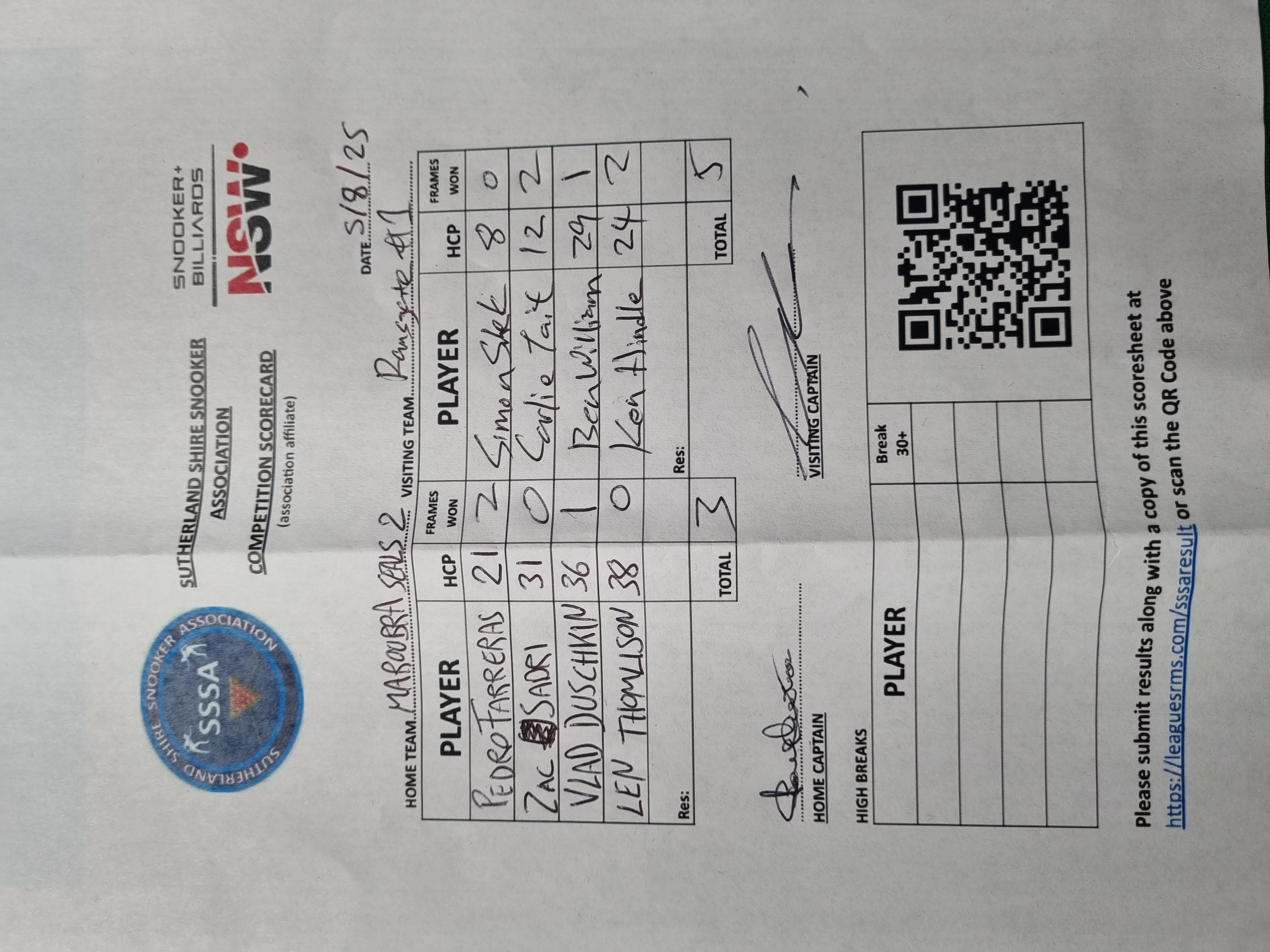 | POS | Maroubra Seals #2 | Frame Won | Break | Ramsgate RSL #1 | Frame Won | Break | Result Note | Updated on | Update by |