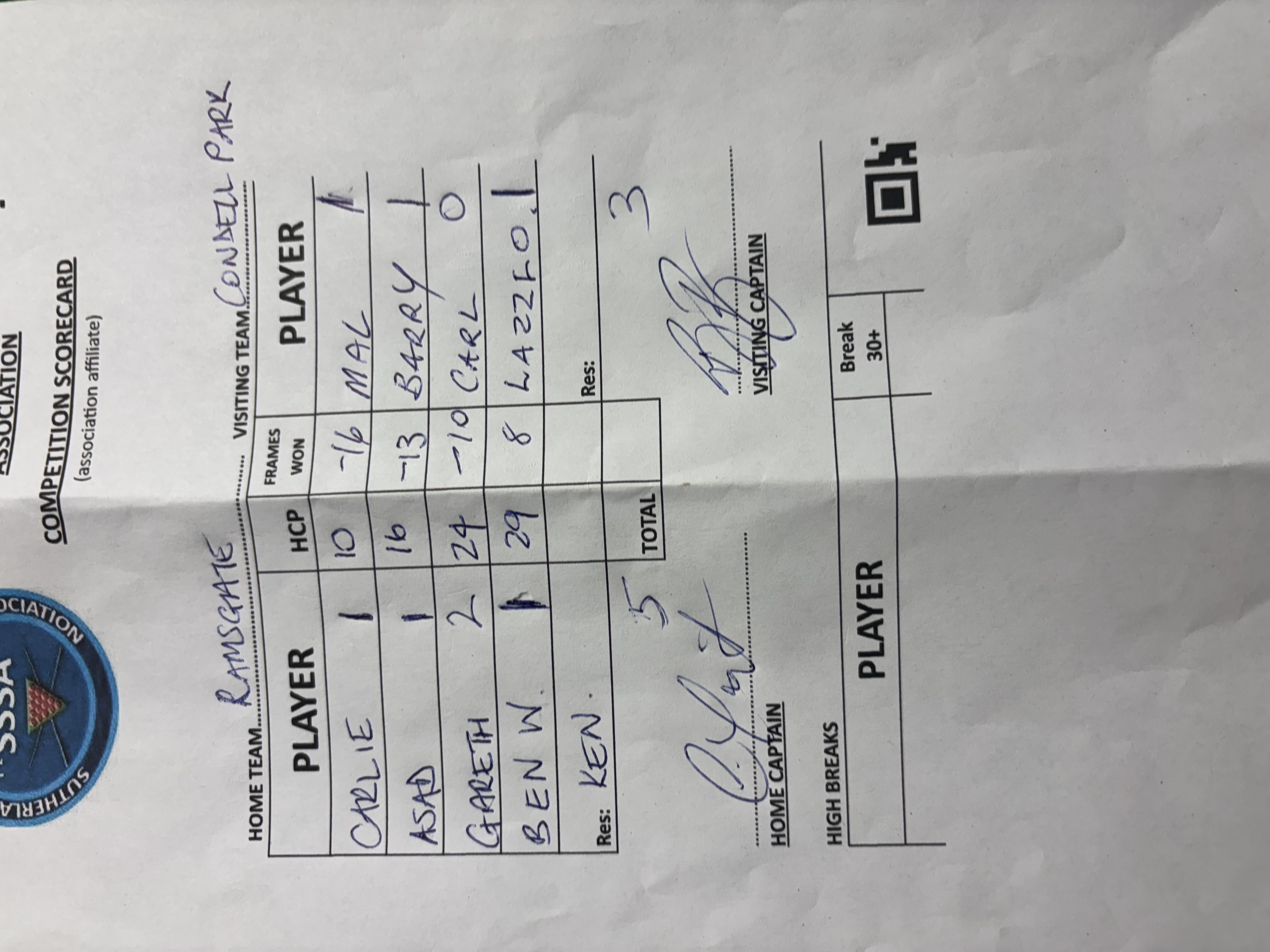 | POS | Ramsgate RSL #1 | Frame Won | Break | Condell Park #1 | Frame Won | Break | Result Note | Updated on | Update by |