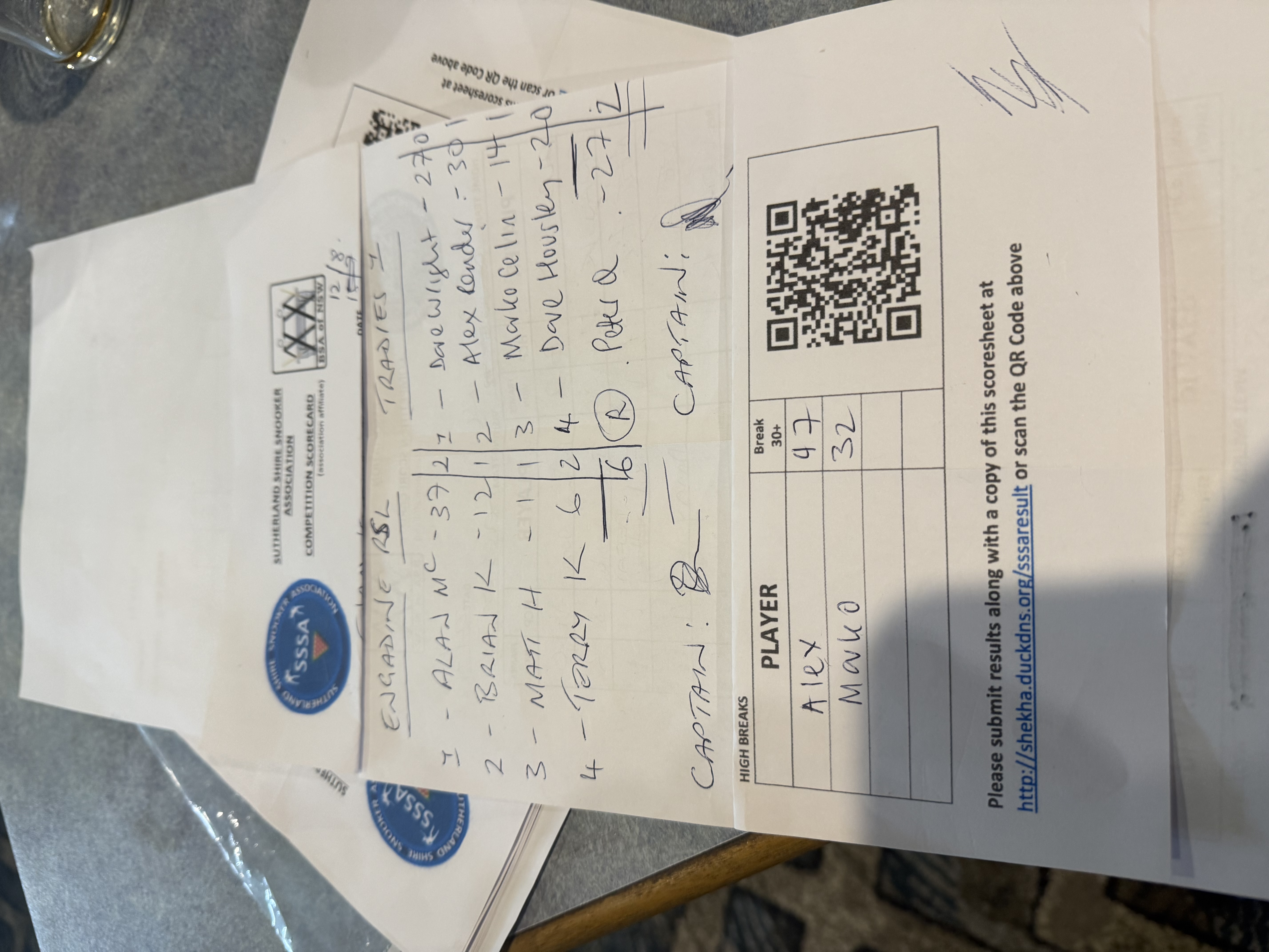 | POS | Engadine #1 | Frame Won | Break | Tradies #1 | Frame Won | Break | Result Note | Updated on | Update by |