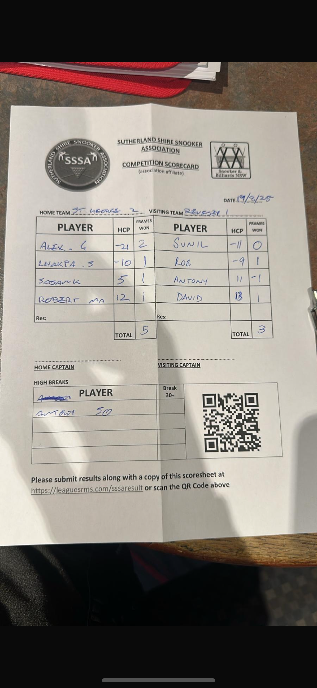 | POS | St George #2 | Frame Won | Break | Revesby Workers #1 | Frame Won | Break | Result Note | Updated on | Update by |