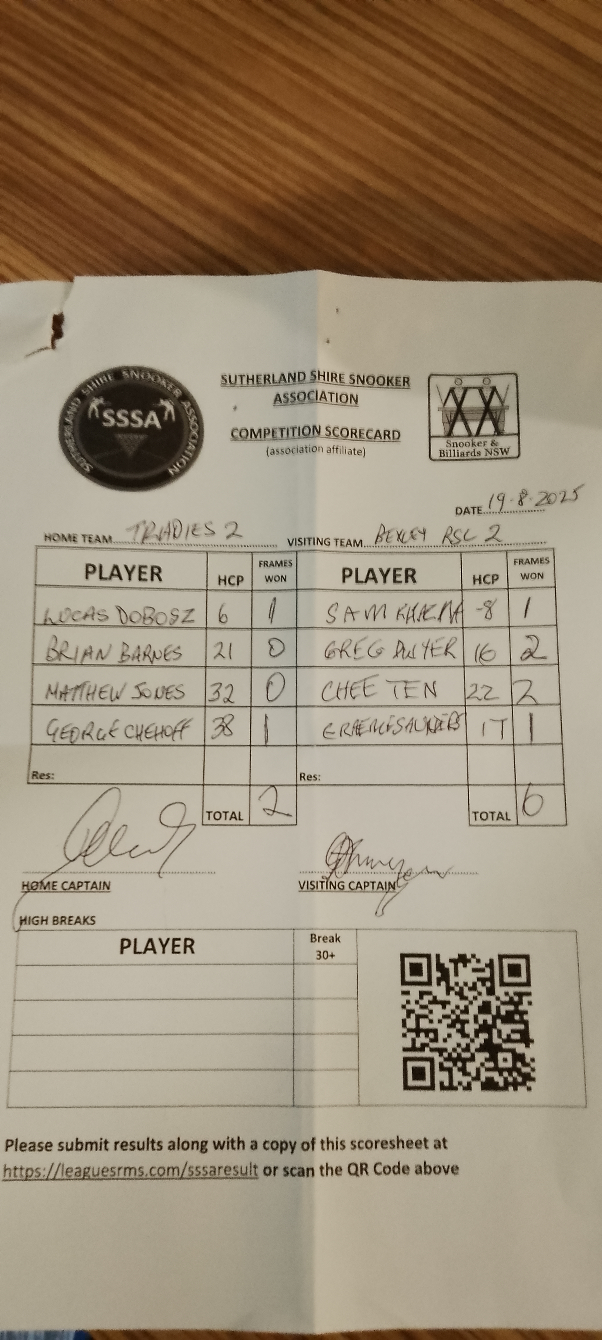 | POS | Tradies #2 | Frame Won | Break | Bexley RSL #2 | Frame Won | Break | Result Note | Updated on | Update by |