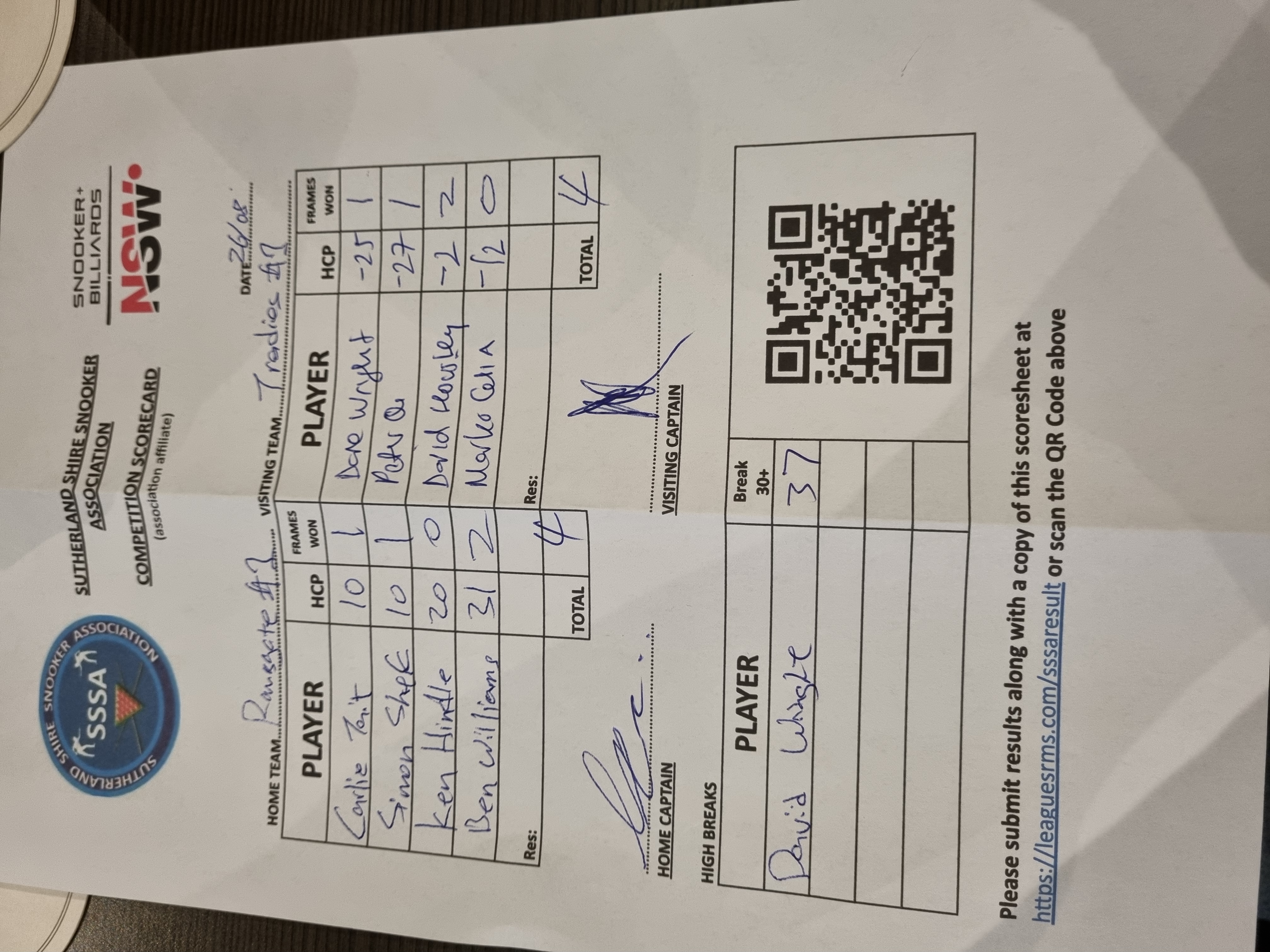 | POS | Ramsgate RSL #1 | Frame Won | Break | Tradies #1 | Frame Won | Break | Result Note | Updated on | Update by |