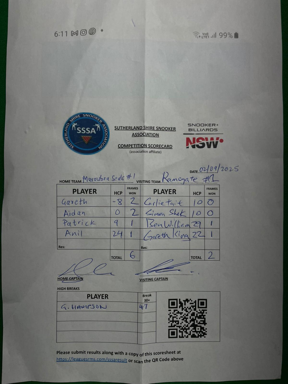 | POS | Maroubra Seals #1 | Frame Won | Break | Ramsgate RSL #1 | Frame Won | Break | Result Note | Updated on | Update by |