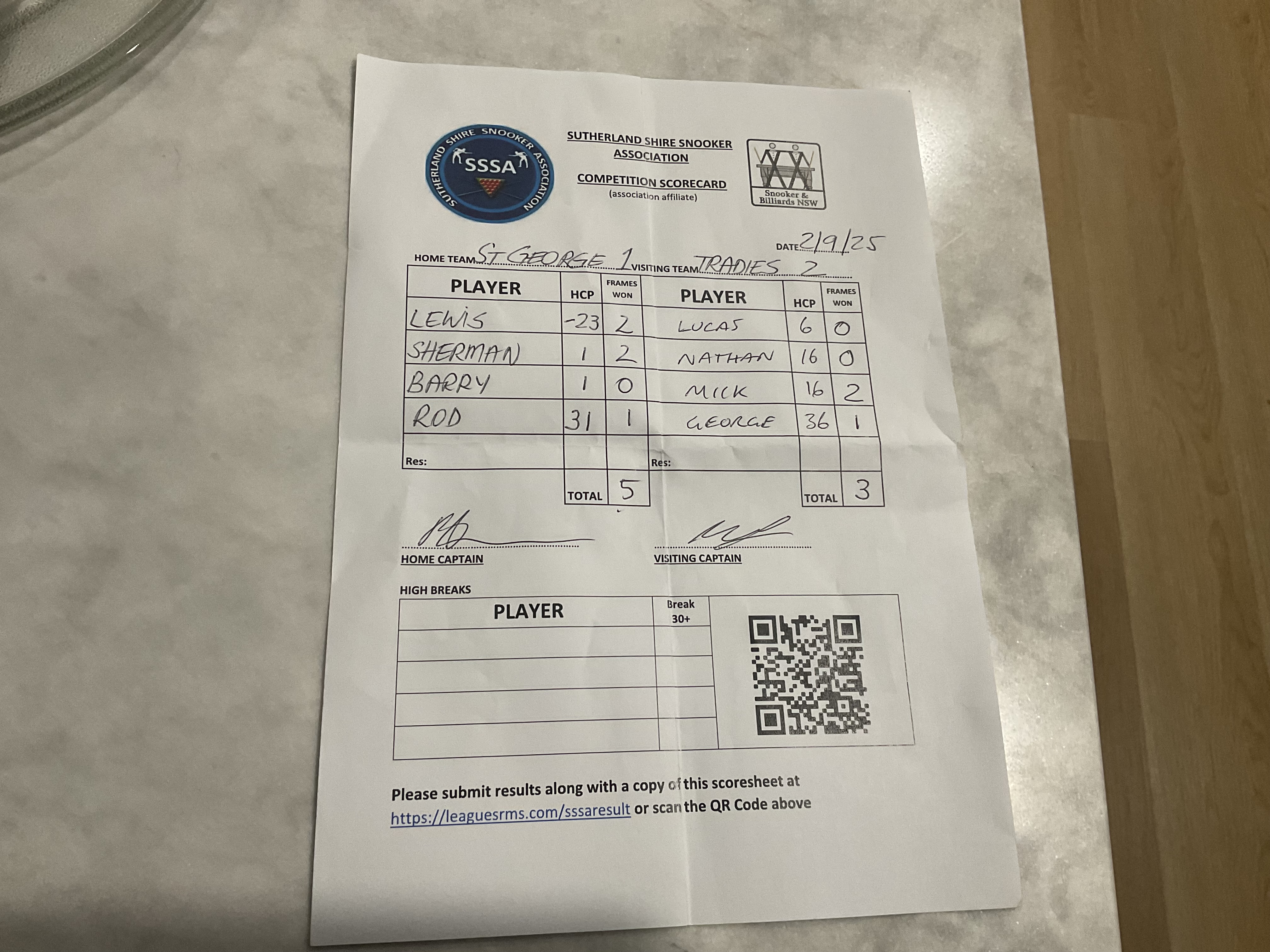 | POS | St George #1 | Frame Won | Break | Tradies #2 | Frame Won | Break | Result Note | Updated on | Update by |