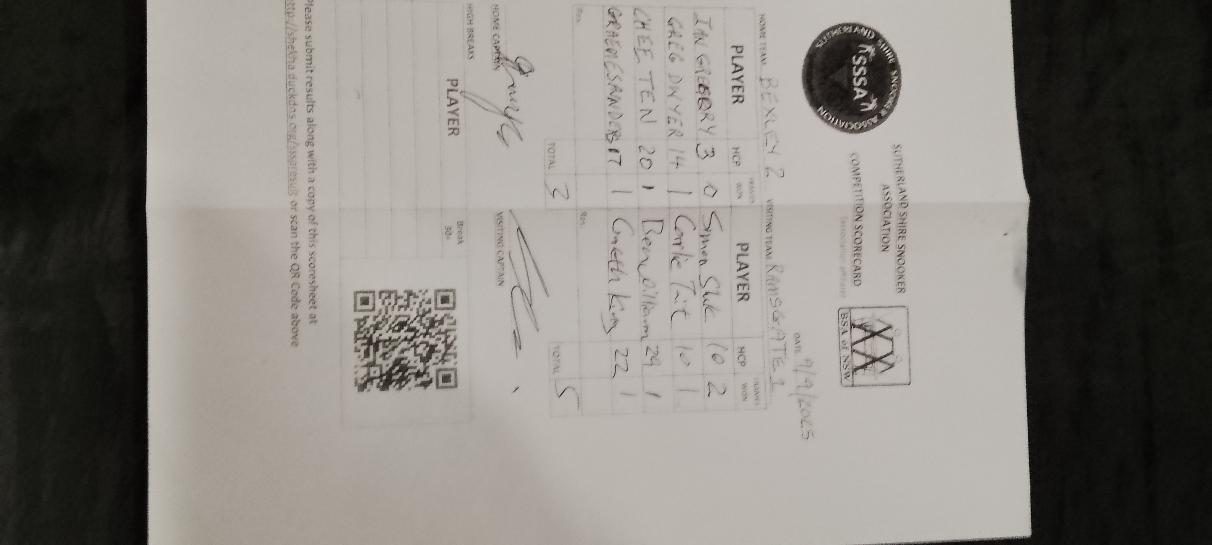 | POS | Bexley RSL #2 | Frame Won | Break | Ramsgate RSL #1 | Frame Won | Break | Result Note | Updated on | Update by |