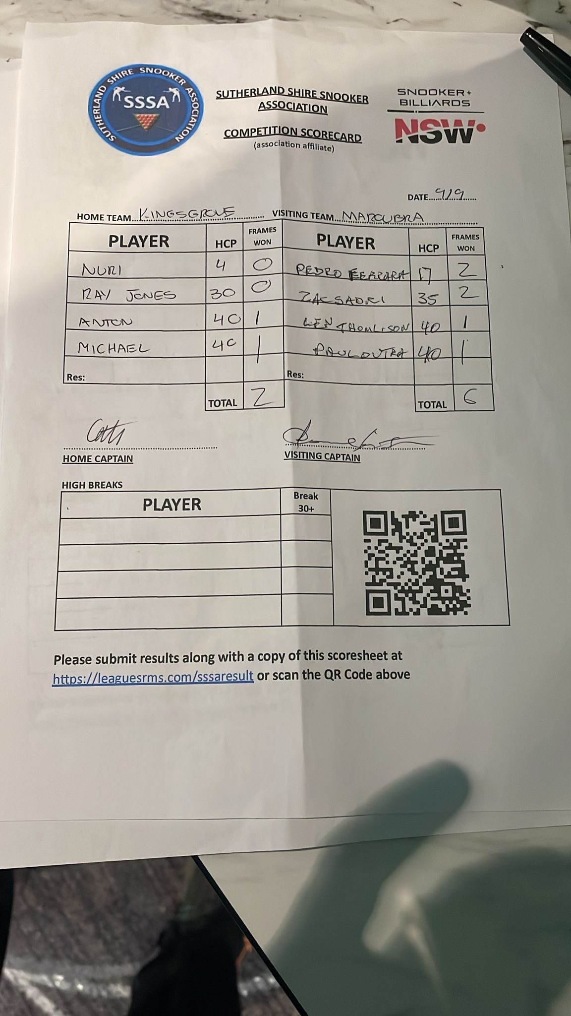| POS | Kingsgrove #1 | Frame Won | Break | Maroubra Seals #2 | Frame Won | Break | Result Note | Updated on | Update by |