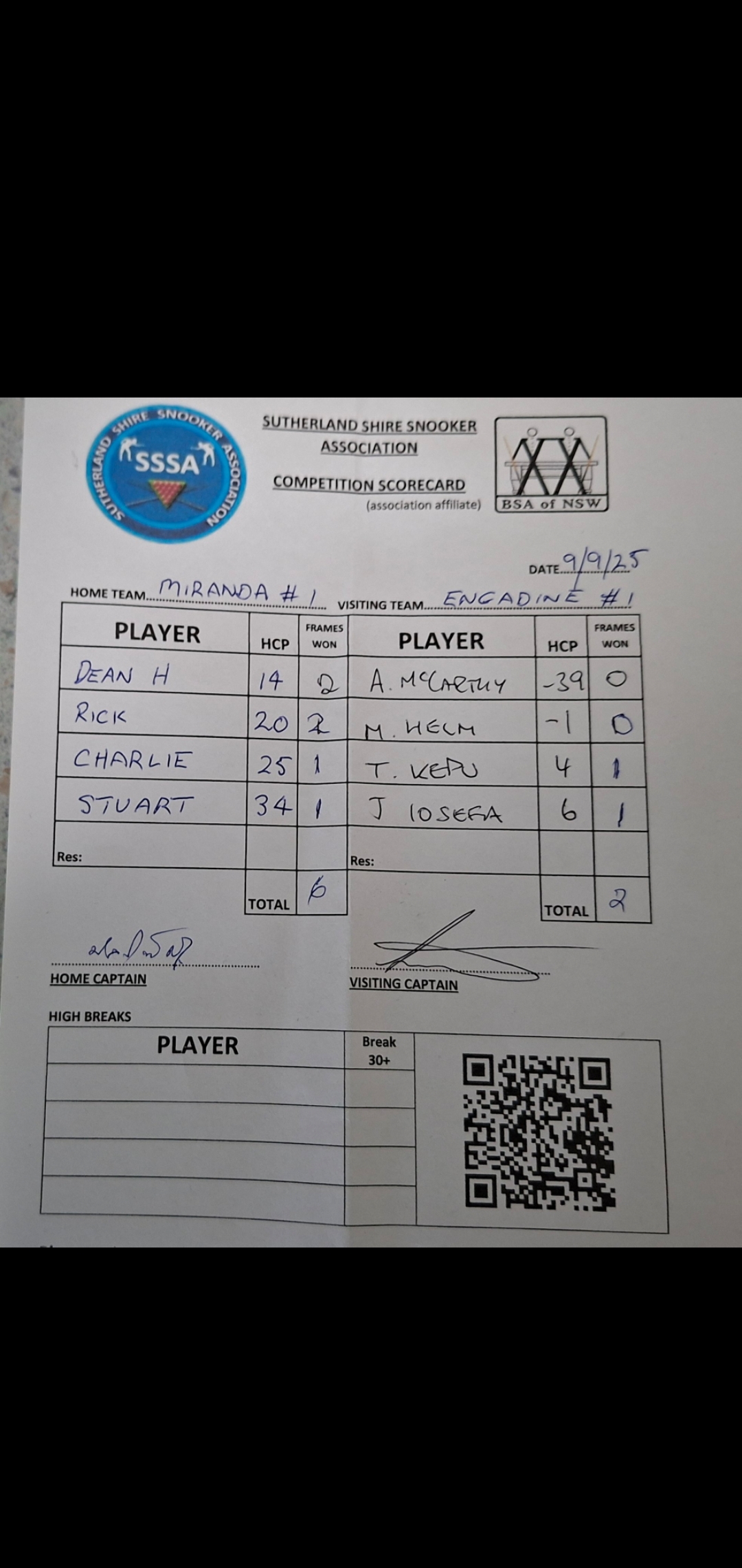 | POS | Miranda RSL #1 | Frame Won | Break | Engadine #1 | Frame Won | Break | Result Note | Updated on | Update by |