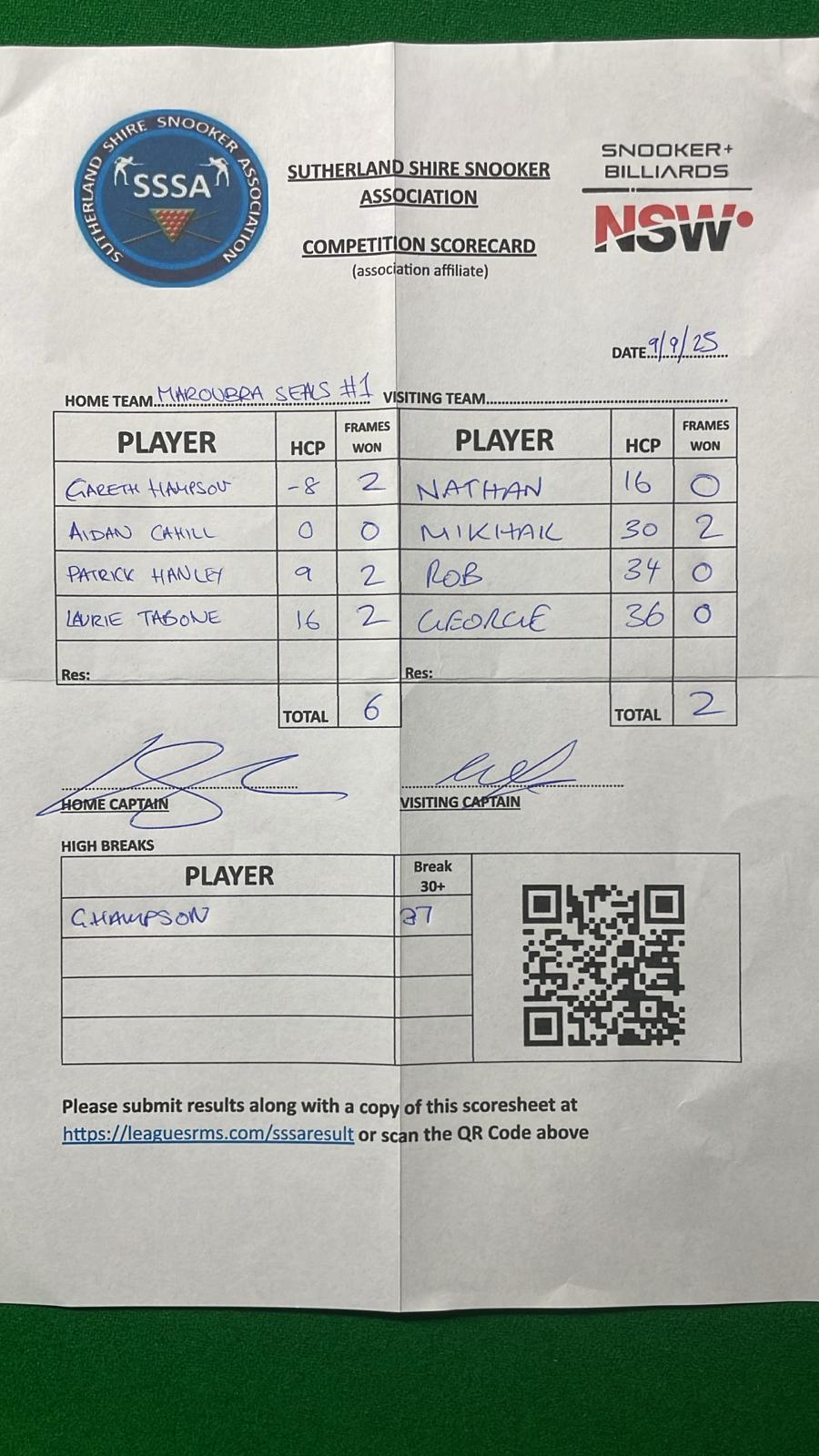 | POS | Maroubra Seals #1 | Frame Won | Break | Tradies #2 | Frame Won | Break | Result Note | Updated on | Update by |
