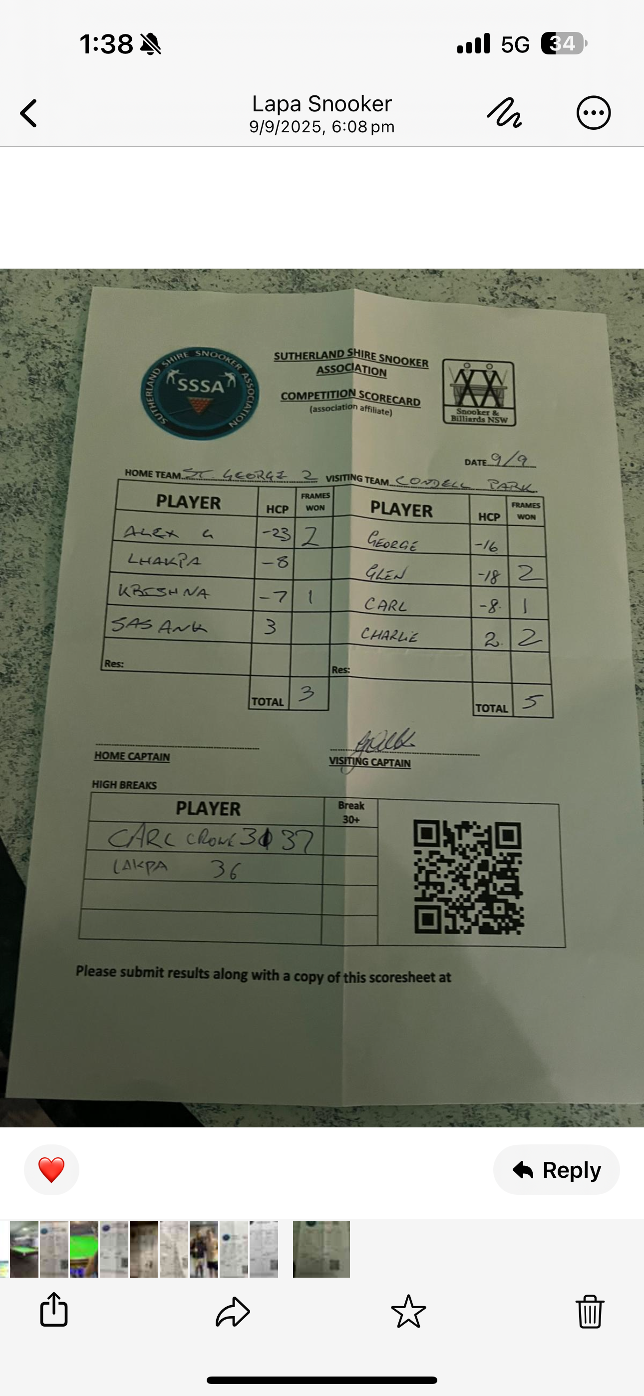 | POS | St George #2 | Frame Won | Break | Condell Park #1 | Frame Won | Break | Result Note | Updated on | Update by |