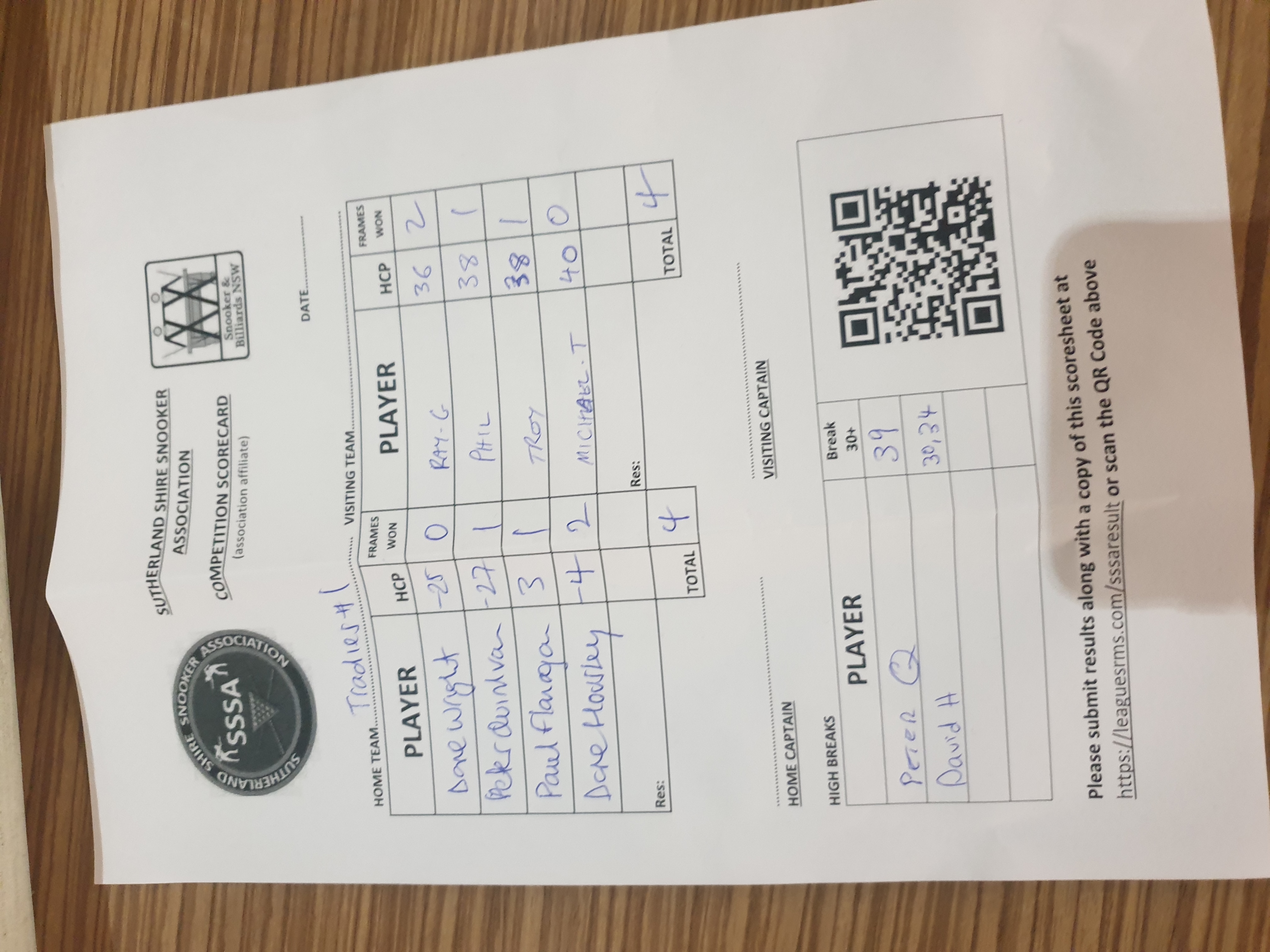 | POS | Tradies #1 | Frame Won | Break | Kingsgrove #1 | Frame Won | Break | Result Note | Updated on | Update by |