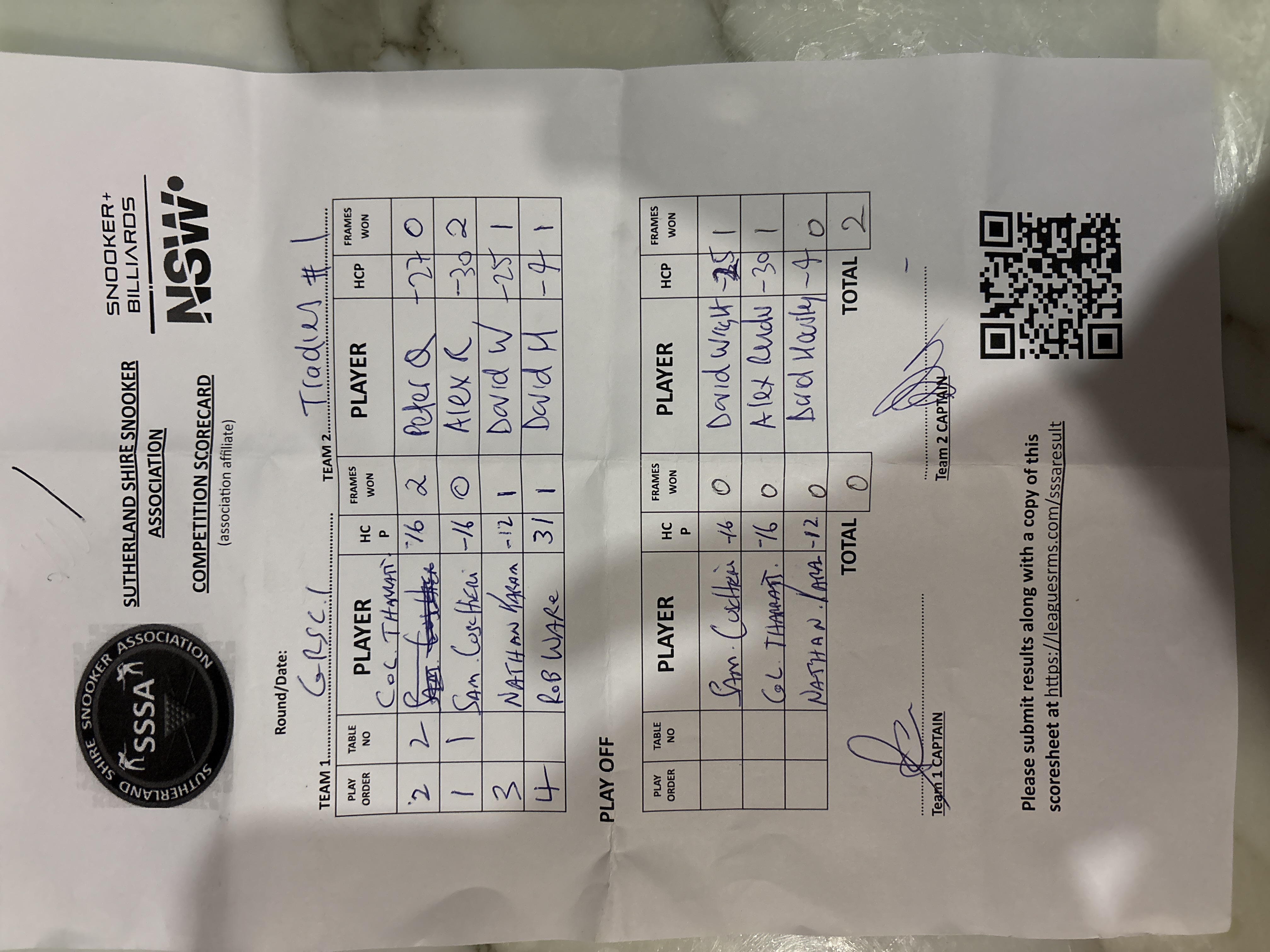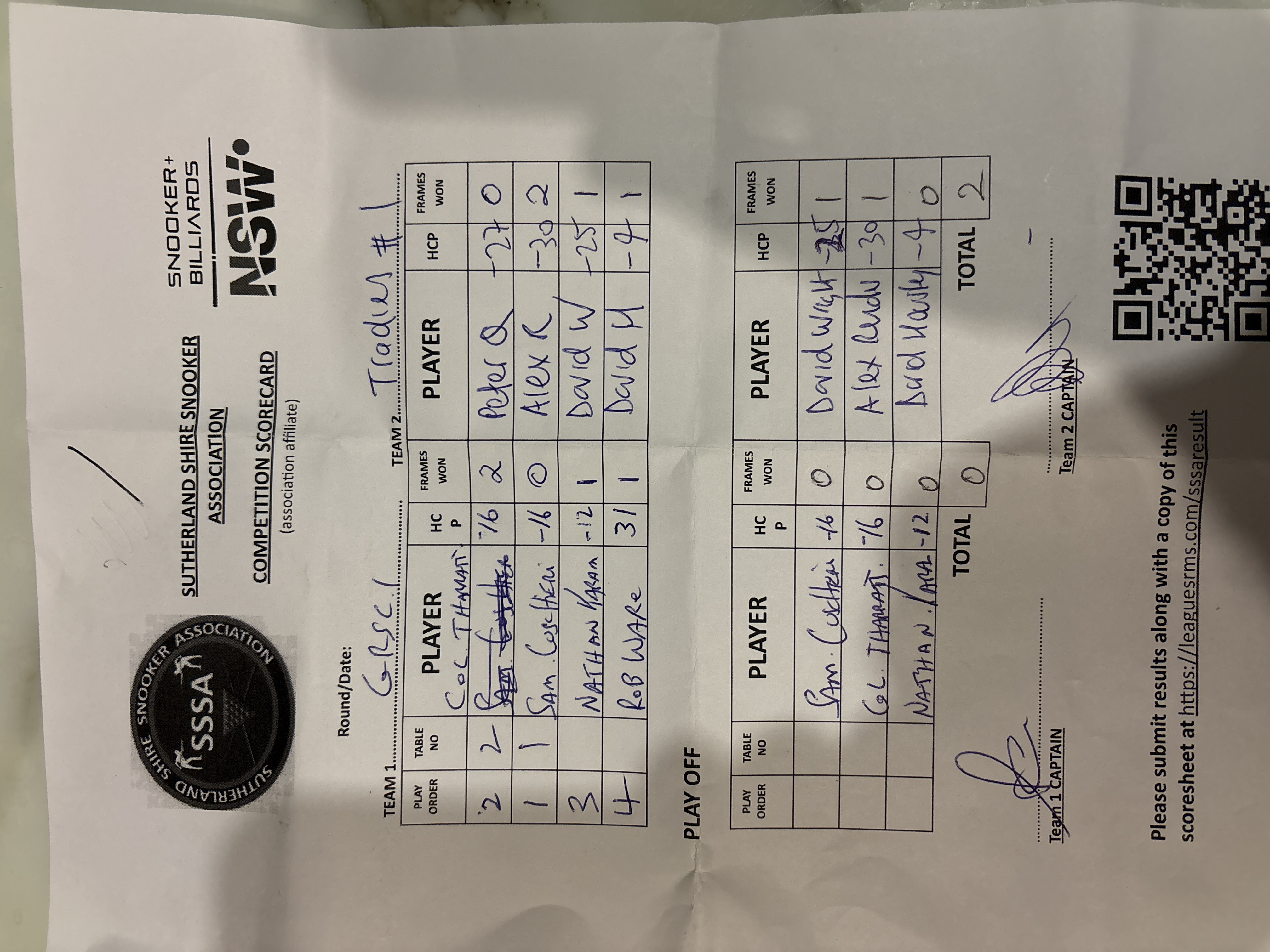 | POS | Georges River #1 | Frame Won | Tradies #1 | Frame Won | Result Note | Updated on | Update by |