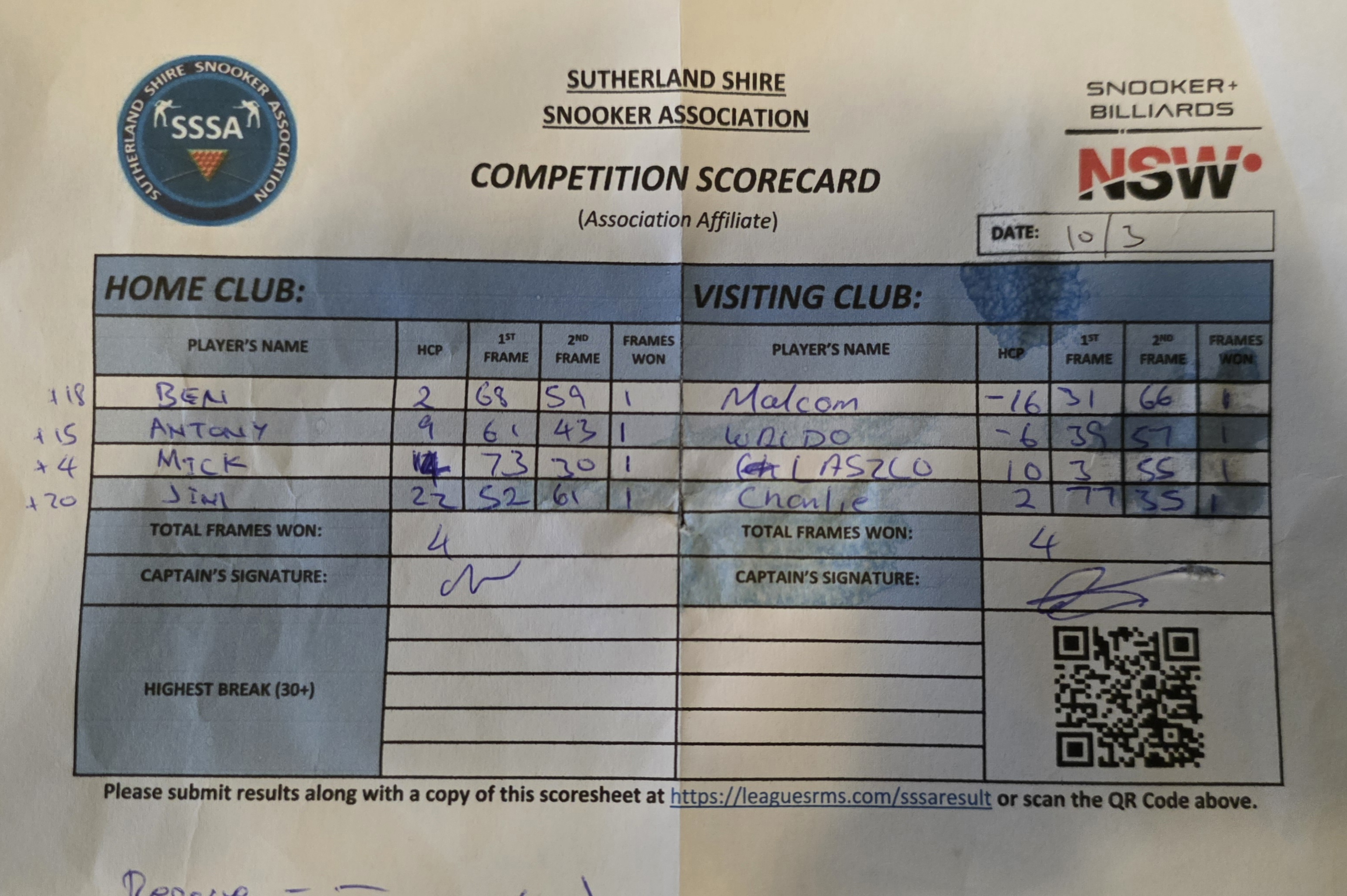 | POS | Revesby Workers #3 | 1st Frame | 2nd Frame | Frame Won | Break | Condell Park #2 | 1st Frame | 2nd Frame | Frame Won | Break | Result Note |