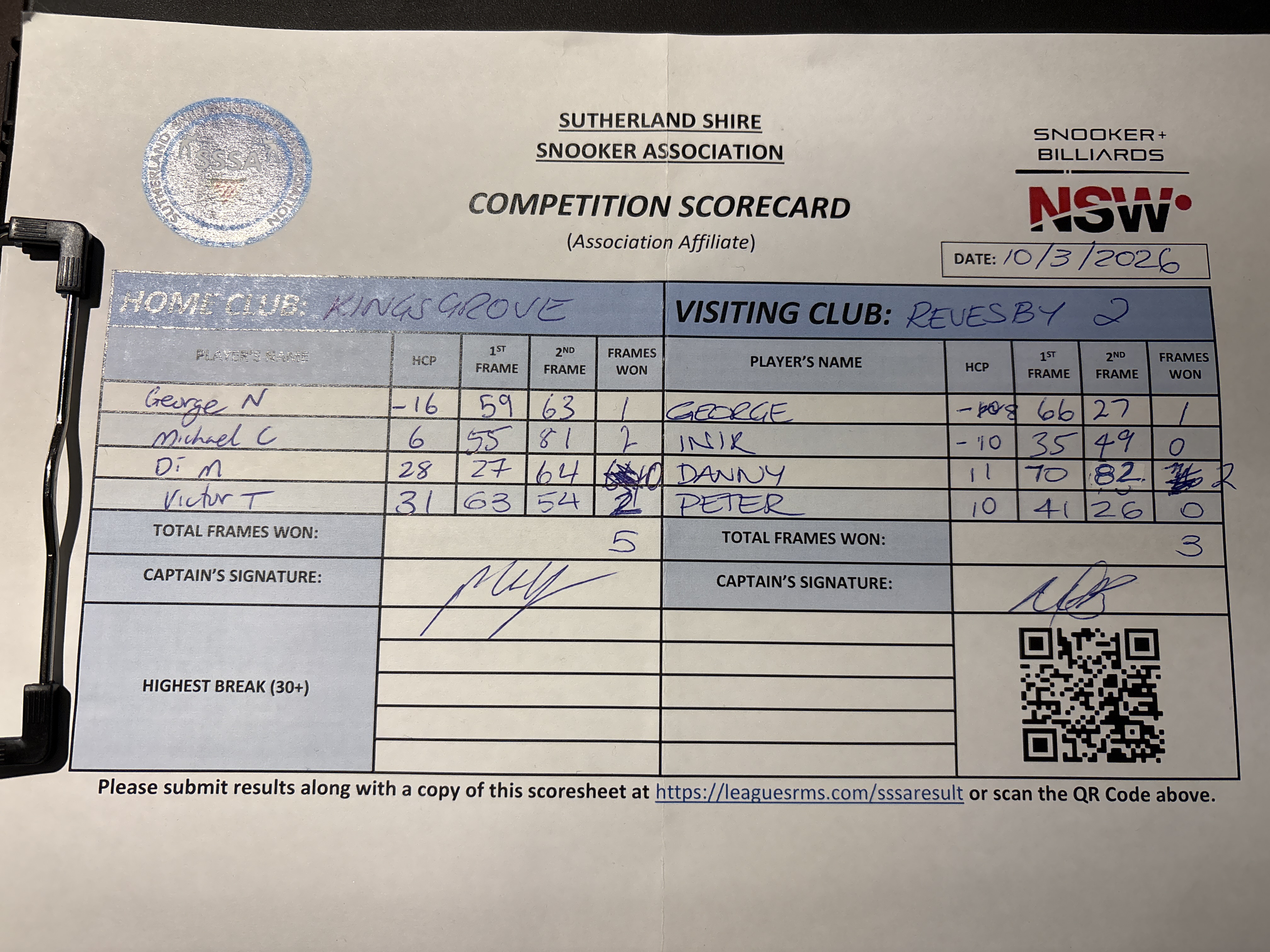 | POS | Kingsgrove #1 | 1st Frame | 2nd Frame | Frame Won | Break | Revesby Workers #2 | 1st Frame | 2nd Frame | Frame Won | Break | Result Note |