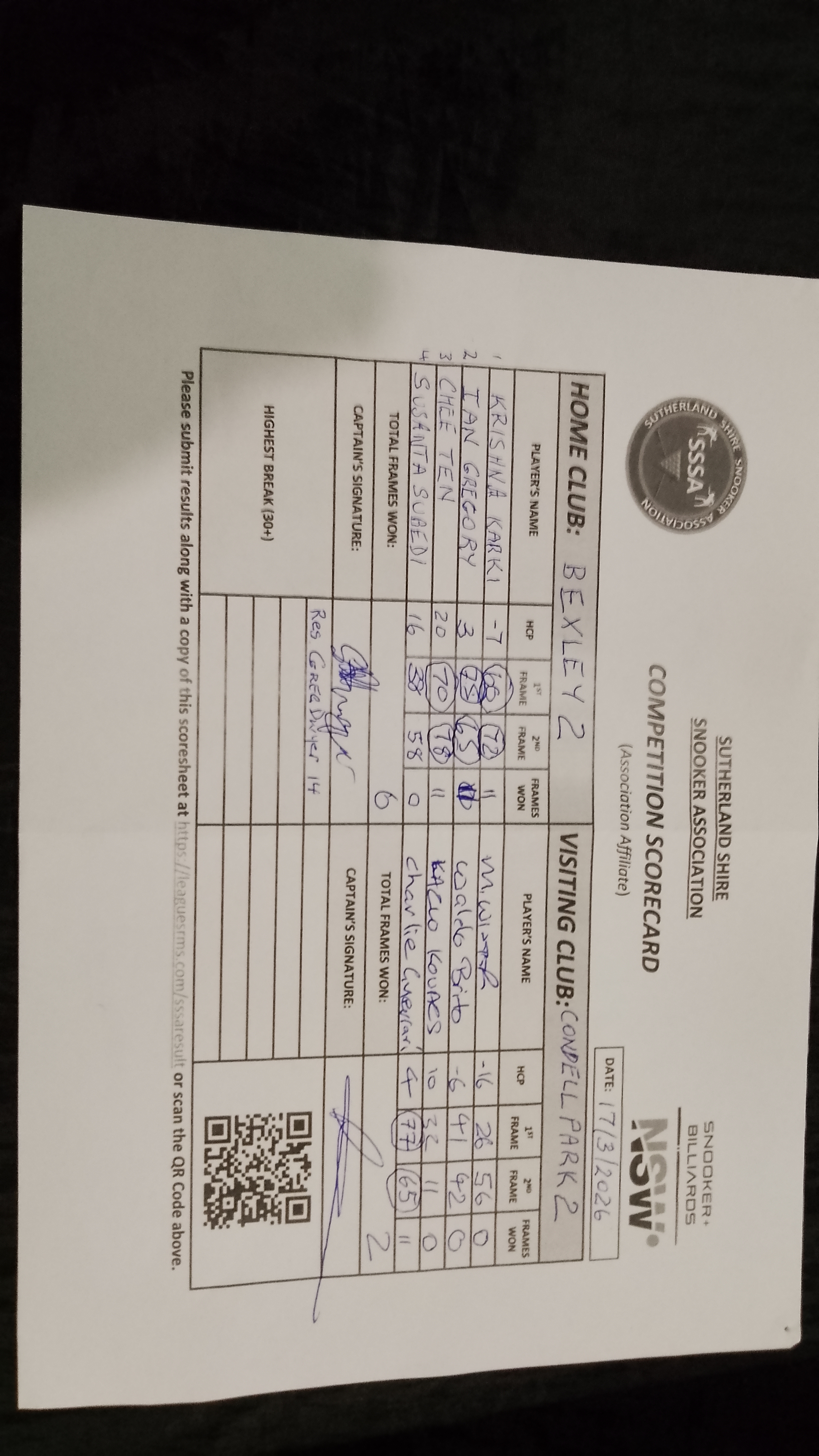 | POS | Bexley RSL #2 | 1st Frame | 2nd Frame | Frame Won | Break | Condell Park #2 | 1st Frame | 2nd Frame | Frame Won | Break | Result Note |