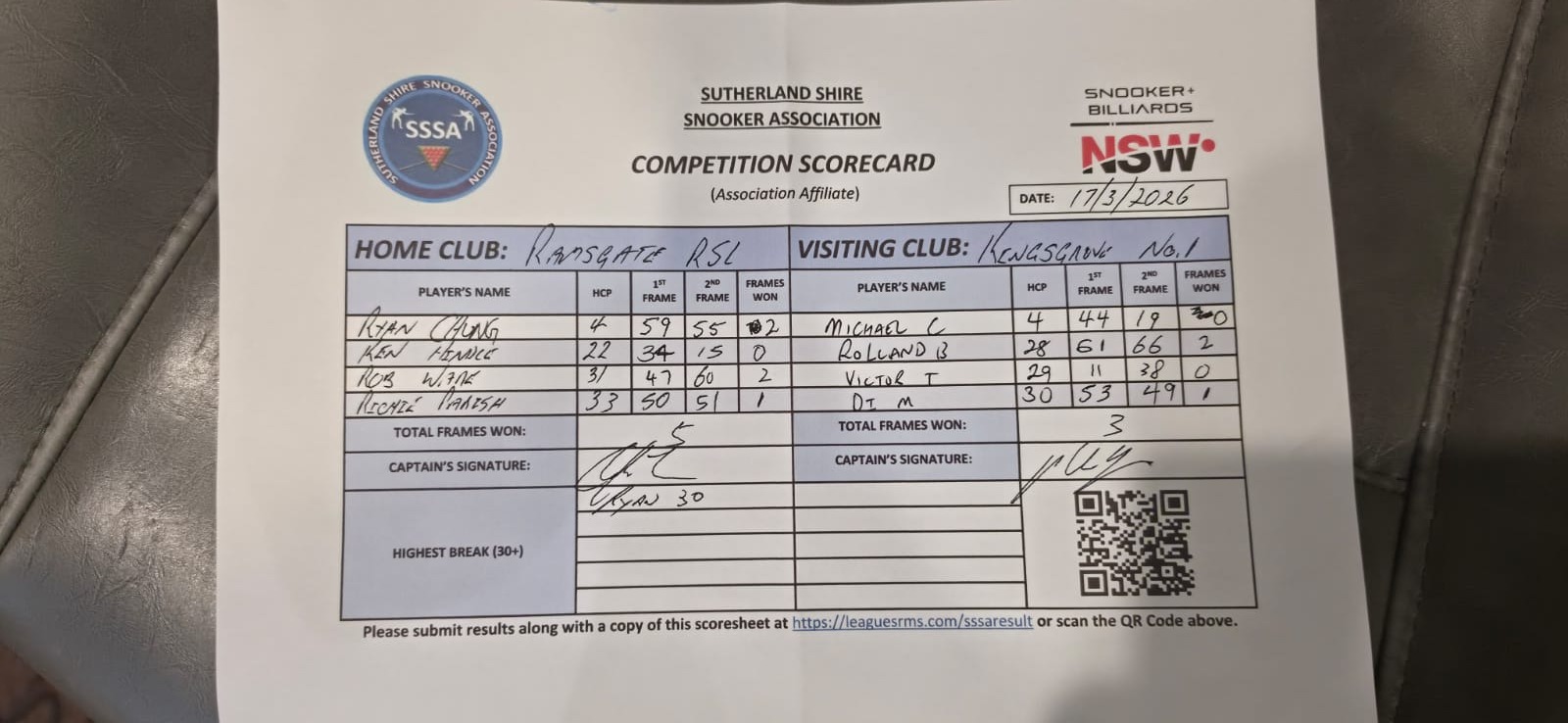 | POS | Ramsgate RSL #1 | 1st Frame | 2nd Frame | Frame Won | Break | Kingsgrove #1 | 1st Frame | 2nd Frame | Frame Won | Break | Result Note |