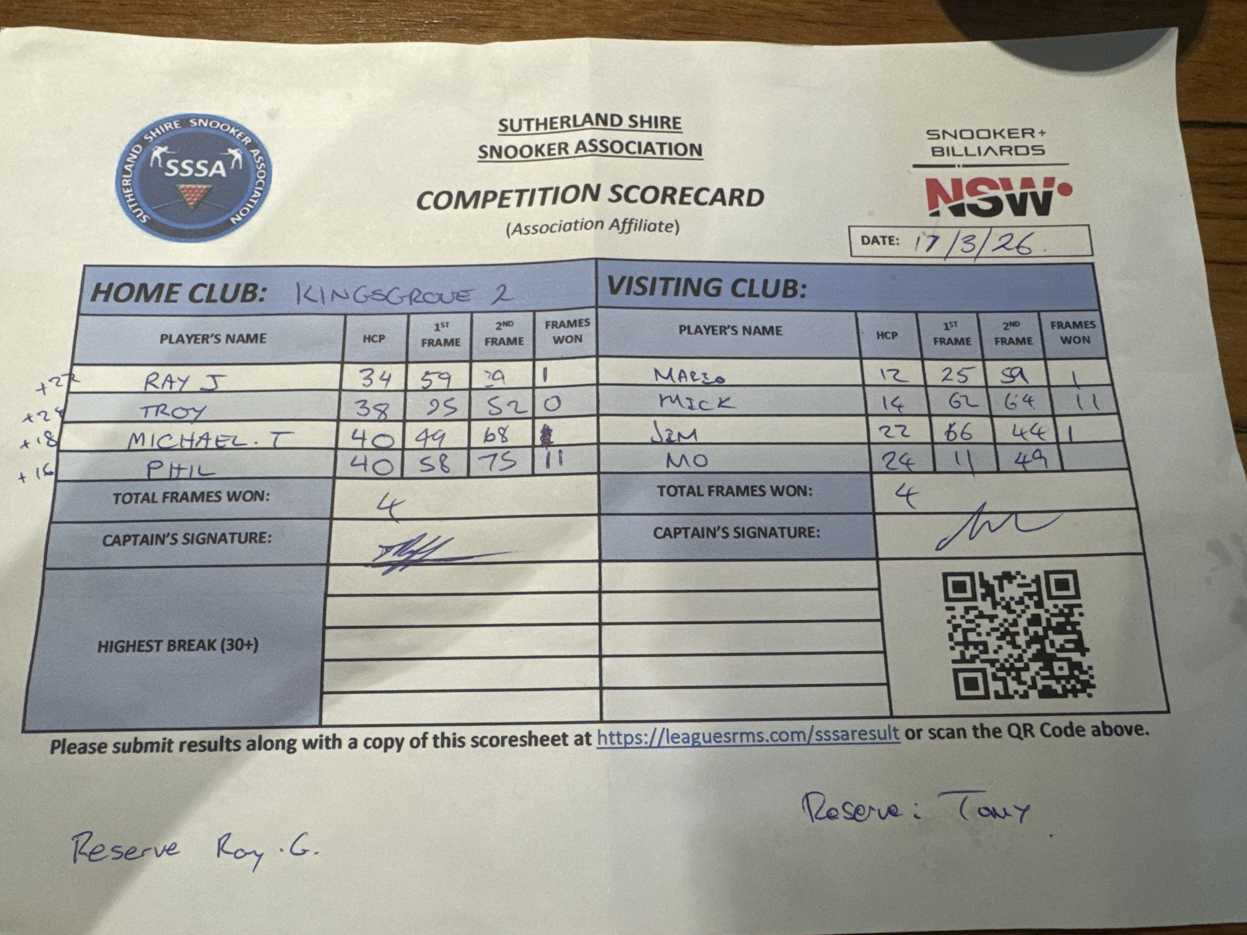 | POS | Kingsgrove #2 | 1st Frame | 2nd Frame | Frame Won | Break | Revesby Workers #3 | 1st Frame | 2nd Frame | Frame Won | Break | Result Note |