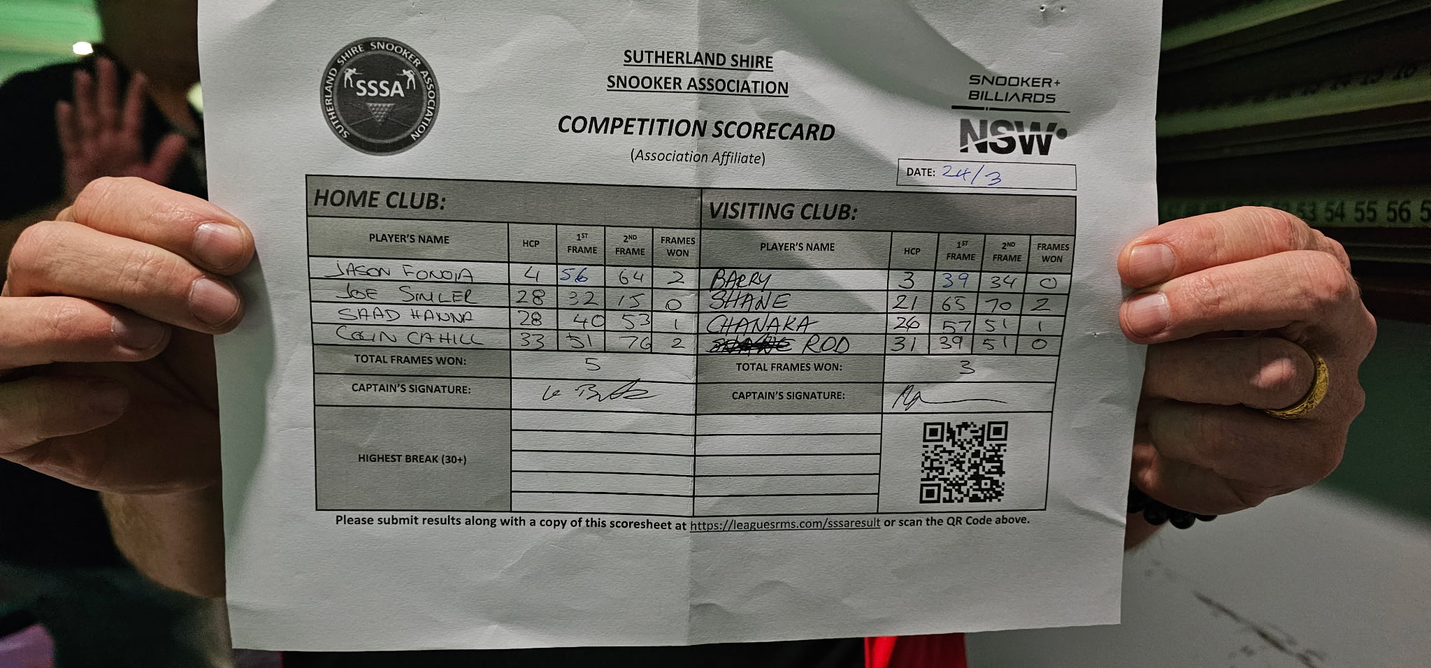 | POS | Condell Park #2 | 1st Frame | 2nd Frame | Frame Won | Break | St George #1 | 1st Frame | 2nd Frame | Frame Won | Break | Result Note |