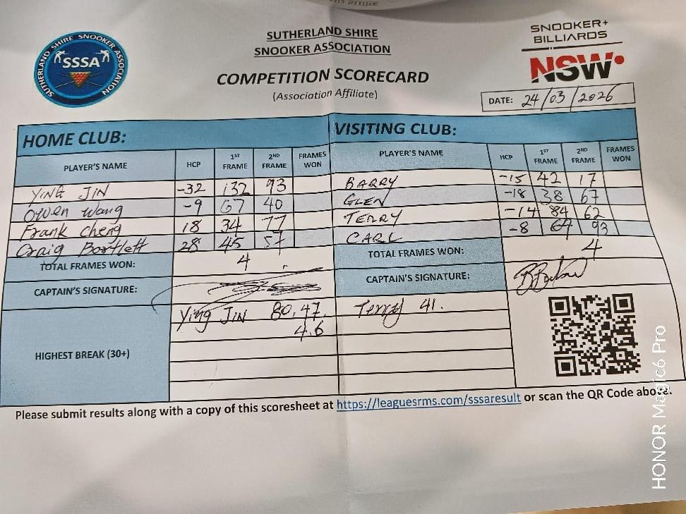 | POS | Panania Diggers #1 | 1st Frame | 2nd Frame | Frame Won | Break | Condell Park #1 | 1st Frame | 2nd Frame | Frame Won | Break | Result Note |