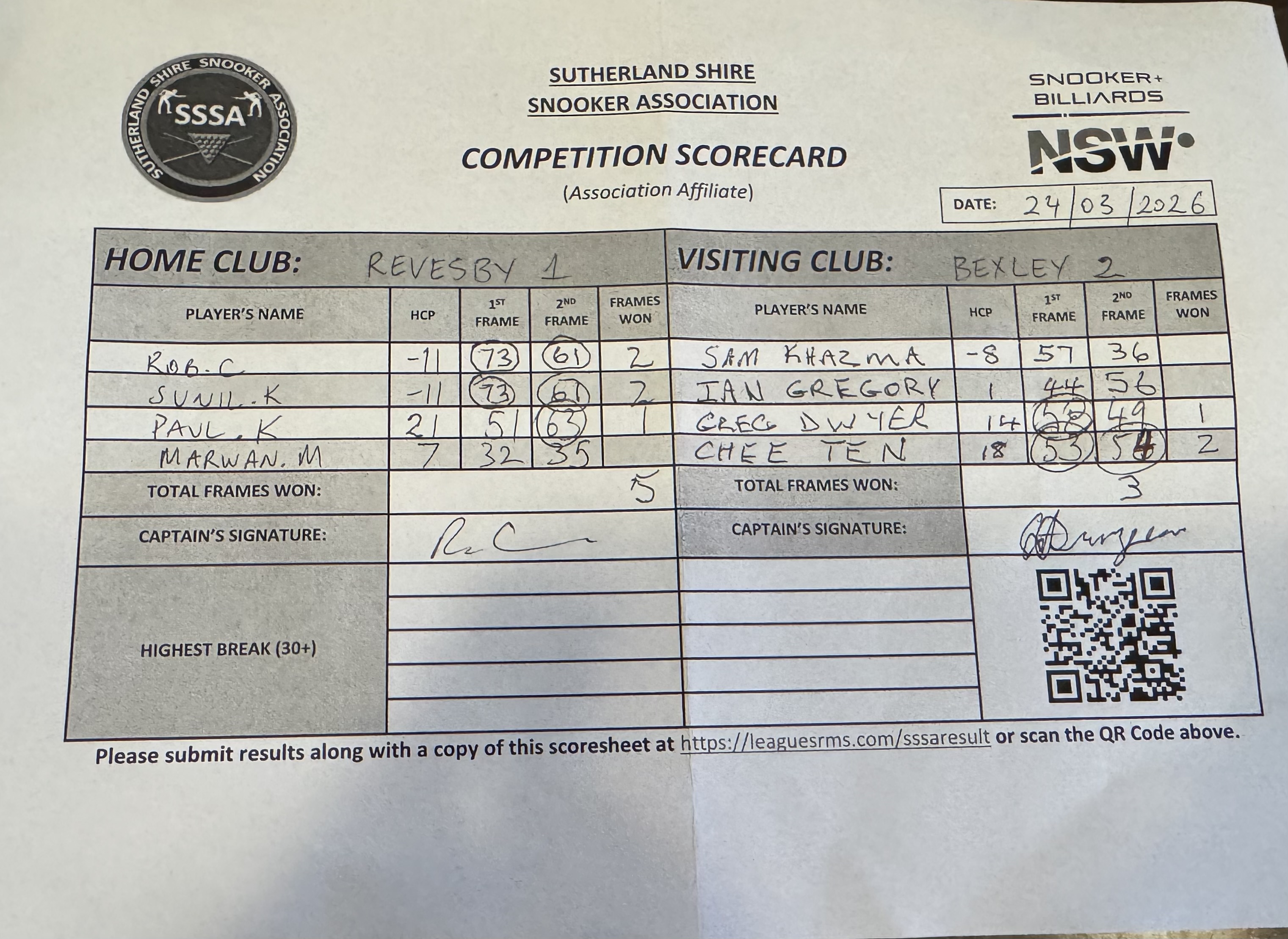 | POS | Revesby Workers #1 | 1st Frame | 2nd Frame | Frame Won | Break | Bexley RSL #2 | 1st Frame | 2nd Frame | Frame Won | Break | Result Note |