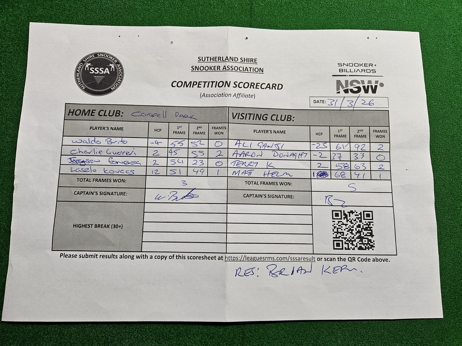 | POS | Condell Park #2 | 1st Frame | 2nd Frame | Frame Won | Break | Engadine #1 | 1st Frame | 2nd Frame | Frame Won | Break | Result Note |