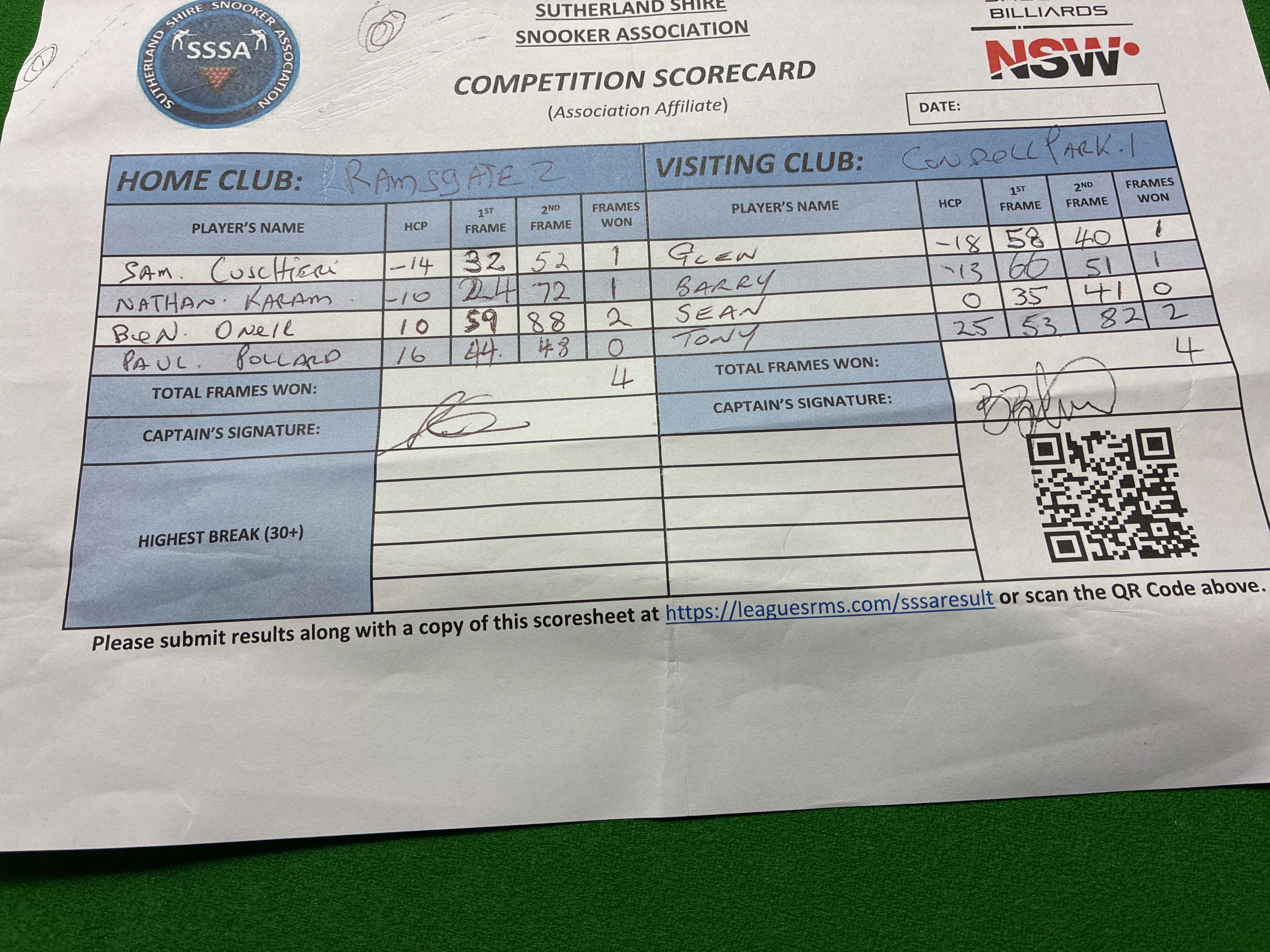 | POS | Ramsgate RSL #2 | 1st Frame | 2nd Frame | Frame Won | Break | Condell Park #1 | 1st Frame | 2nd Frame | Frame Won | Break | Result Note |